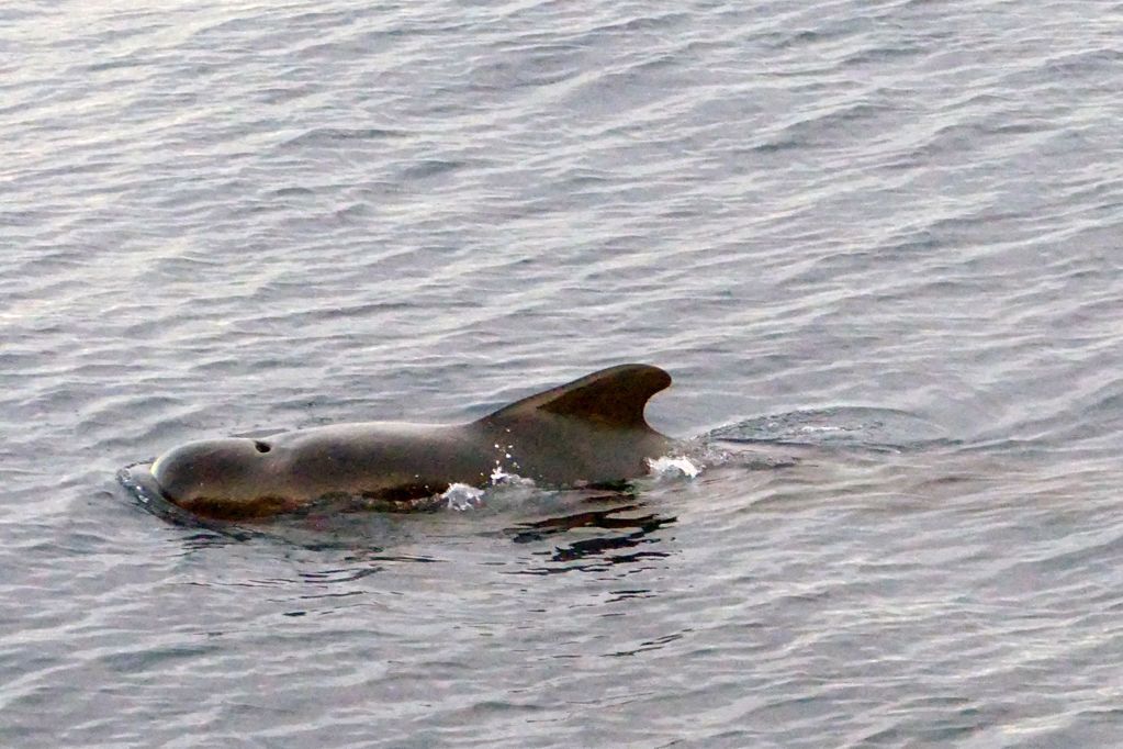 We were able to identify one marked by a collapsed dorsal fin: B10, a male born in 1987. His brother was born in 1997, and his mother in 1949. We were able to spend an hour with the killer whales and the pods of Dall’s porpoise interspersed among them. They were speeding along and leaving rooster tail wakes as they went. These porpoises that are sometimes mistaken for baby killer whales (black and white markings) can reach speeds of up to 35 miles an hour.