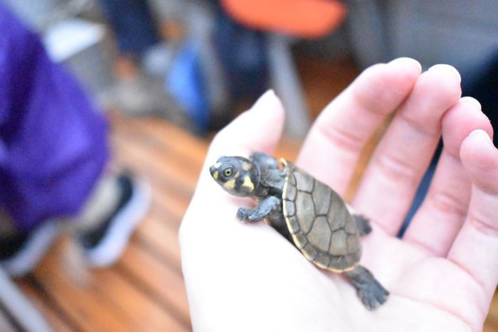 We started this morning with a 5:30 AM wake-up call to board the skiffs and explore Nauta Creek before breakfast. Along our way, we passed a ranger station where local villagers work to protect their environment from overfishing and logging. We’ve seen these stations throughout the Pacaya-Samiria Reserve, along with signage and other attempts to maintain the unique environment. At this ranger station, workers gave us about 80 baby sea turtles to release deeper into the reserve. These workers collect sea turtle eggs to protect and incubate them until the turtles hatch to ensure they will be around for future generations. We all had the opportunity to place these wiggly babies into the creek. On our way back to the ship, we stopped to watch several squirrel monkeys playing and leaping among trees. We had seen them before, but not so many and not so clearly that we could enjoy their sport.