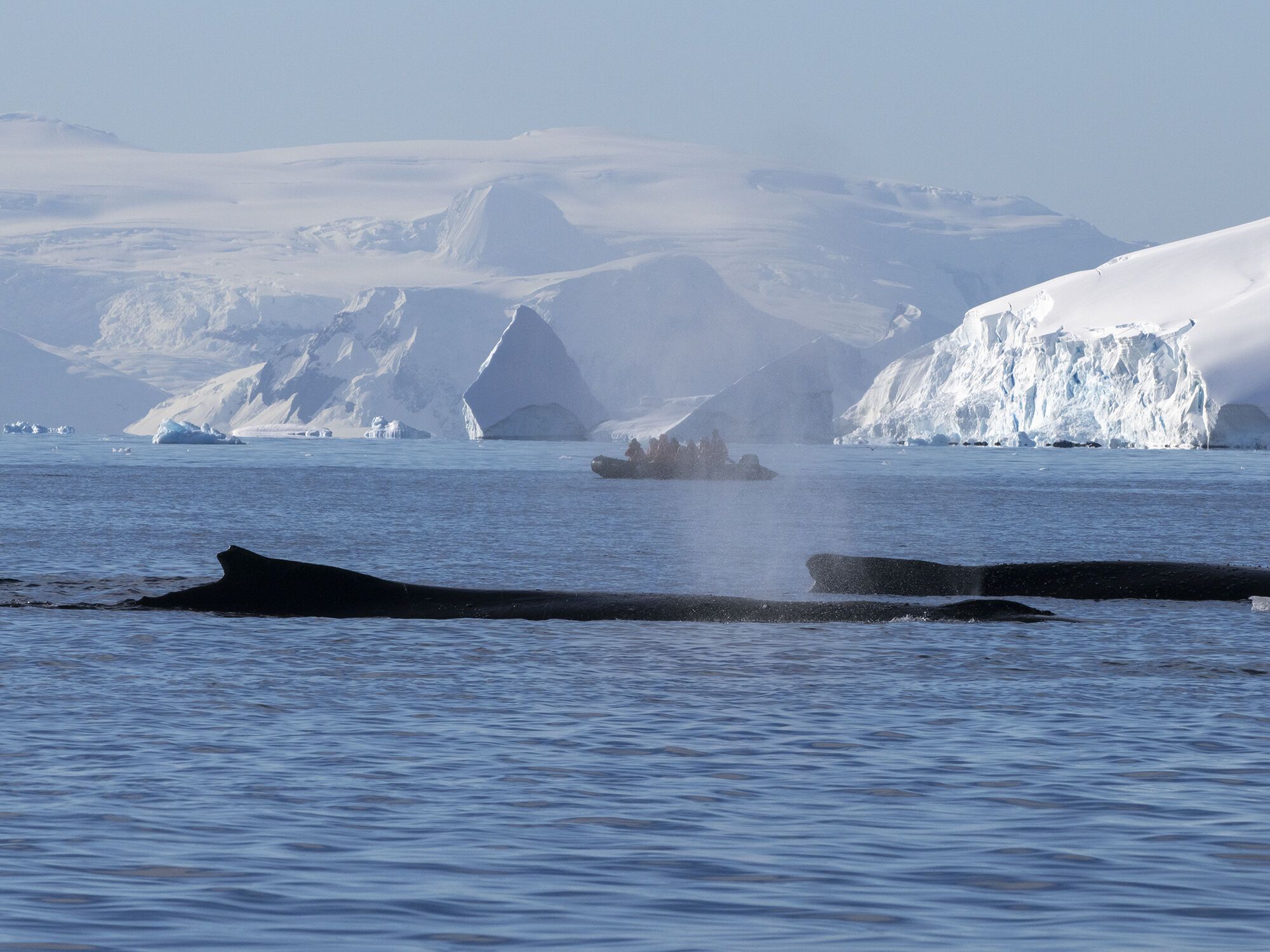 In the afternoon, we ventured to Wilhelmina Bay, often called "Whale-mina Bay" for good reason. Framed by jagged, ice-draped mountains, this vast, icy expanse is a prime feeding ground for whales, drawn to its nutrient-rich waters. Humpback whales, dozens of them, welcomed us, their graceful movements mesmerizing. Aboard our Zodiacs, we drifted among these gentle giants, listening in awe as their deep, rhythmic breaths echoed across the bay.