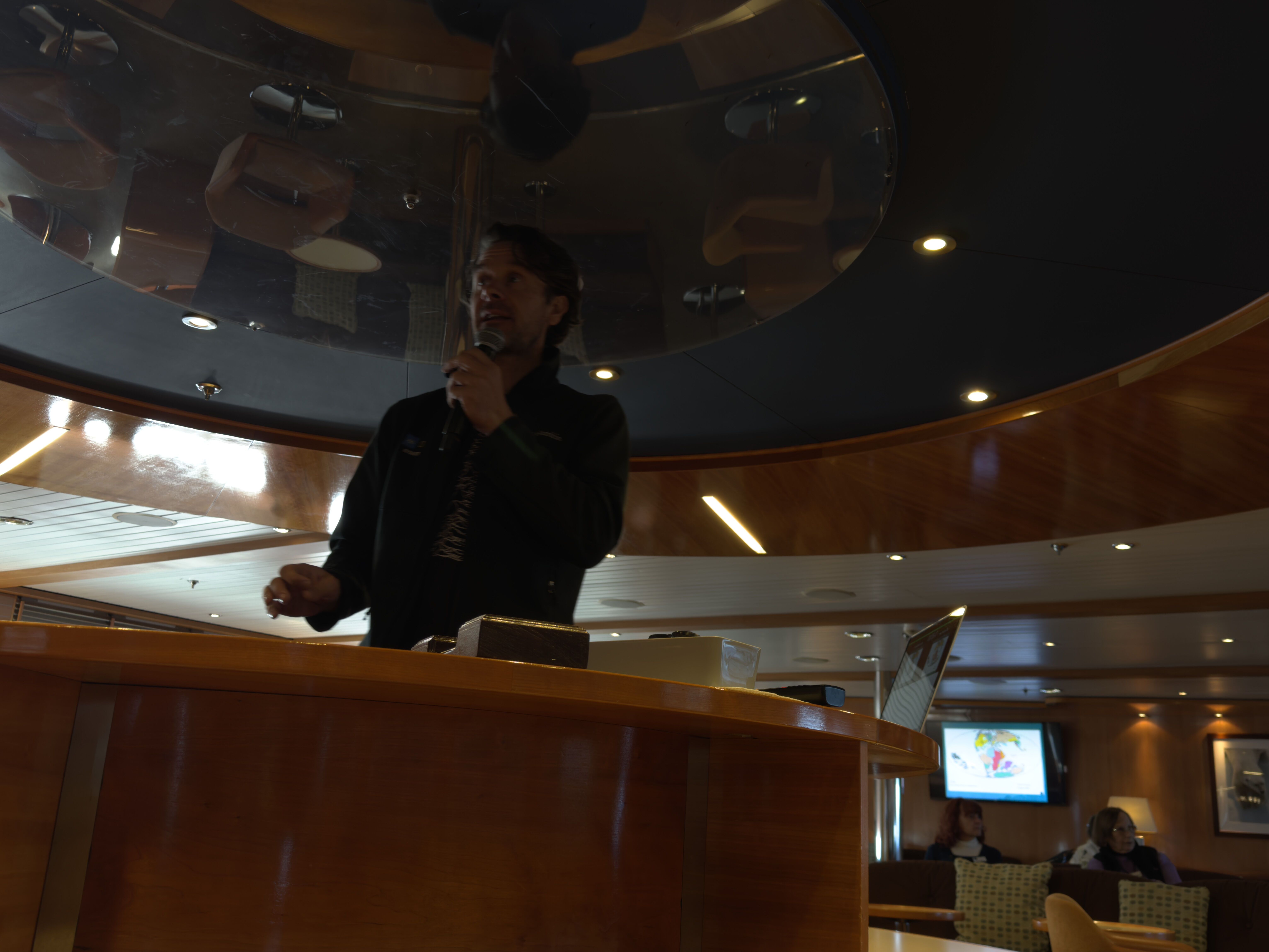 The ship awoke on the productive Southern Ocean immersed in fog and surrounded by icebergs, a navigational dream for the bridge team. As we sailed away from South Georgia towards our next destination, visibility increased for spells, offering brief glimpses of ice, albatrosses, petrels, and fin whales to those close to the windows. Fortunately, there was a rich line up of presentations, including ones by our guest scientists and our National Geographic photographer.