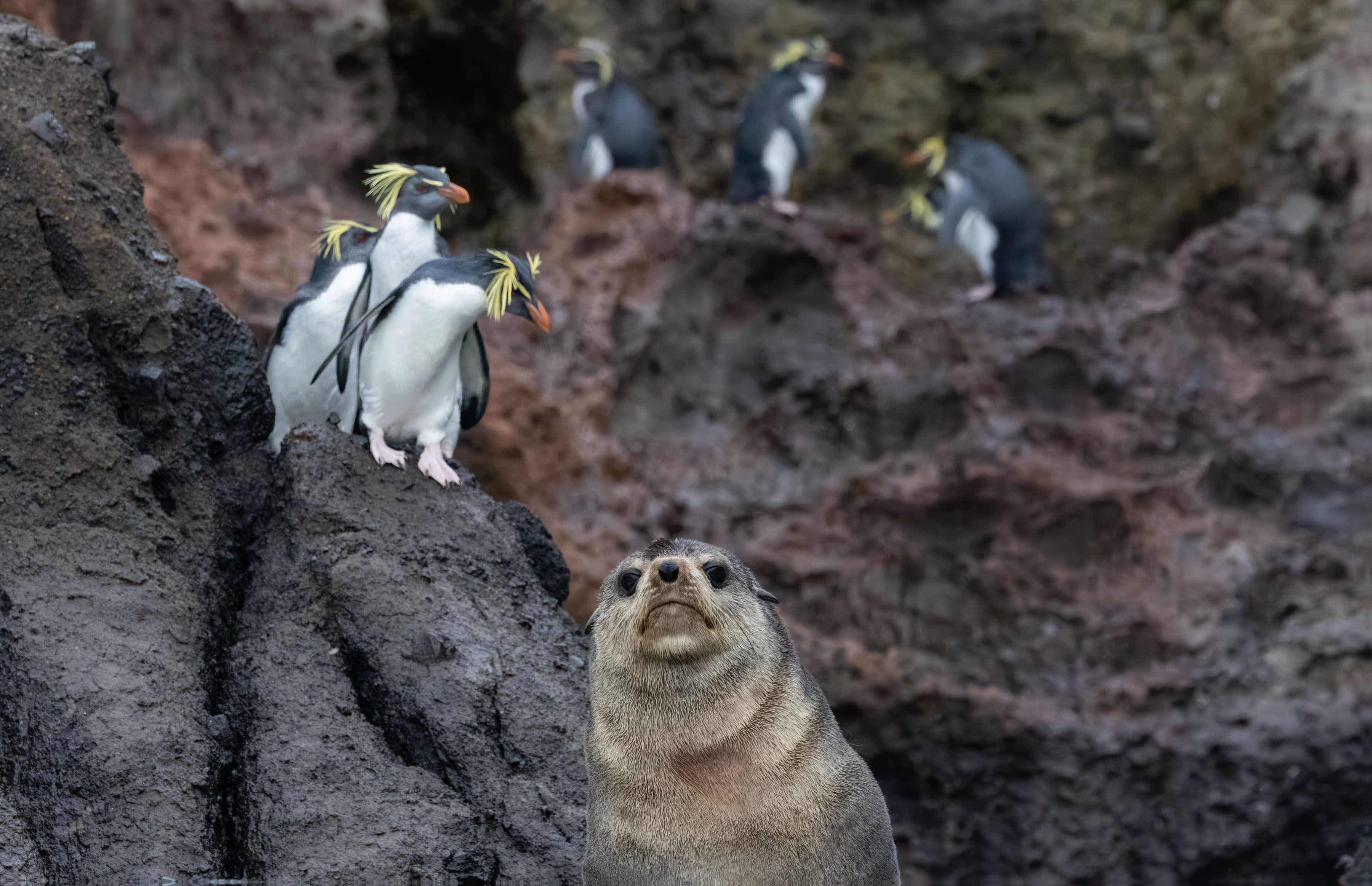 Today was one of the most exhilarating days of the whole expedition so far. We started the day with a 90-minute Zodiac cruise along the coast of Nightingale Island. This extremely remote island, some 43 kilometers south-southeast of Tristan da Cunha, was always going to be a challenge to see, with big swells and high winds. But we were extremely lucky. The swell and winds decreased and the sun came out. We carefully maneuvered Zodiacs to a place where we got excellent close-up views of northern rockhopper penguins. Approximately 90% of this small penguin species, with its weird long yellow crest, breed in these islands. It was such a treat to watch them and take photographs, while sitting in a Zodiac just off shore. Sub-Antarctic fur seals were also in abundance and added to the excitement. After lunch we relocated to Inaccessible Island, another volcanic island around 31 kilometers from Tristan da Cunha. We took a ship cruise around the island getting wonderful views of the abundance of seabirds, including great shearwaters, yellow-nosed albatrosses, and spectacled petrels. We waited until the winds receded before heading out again.