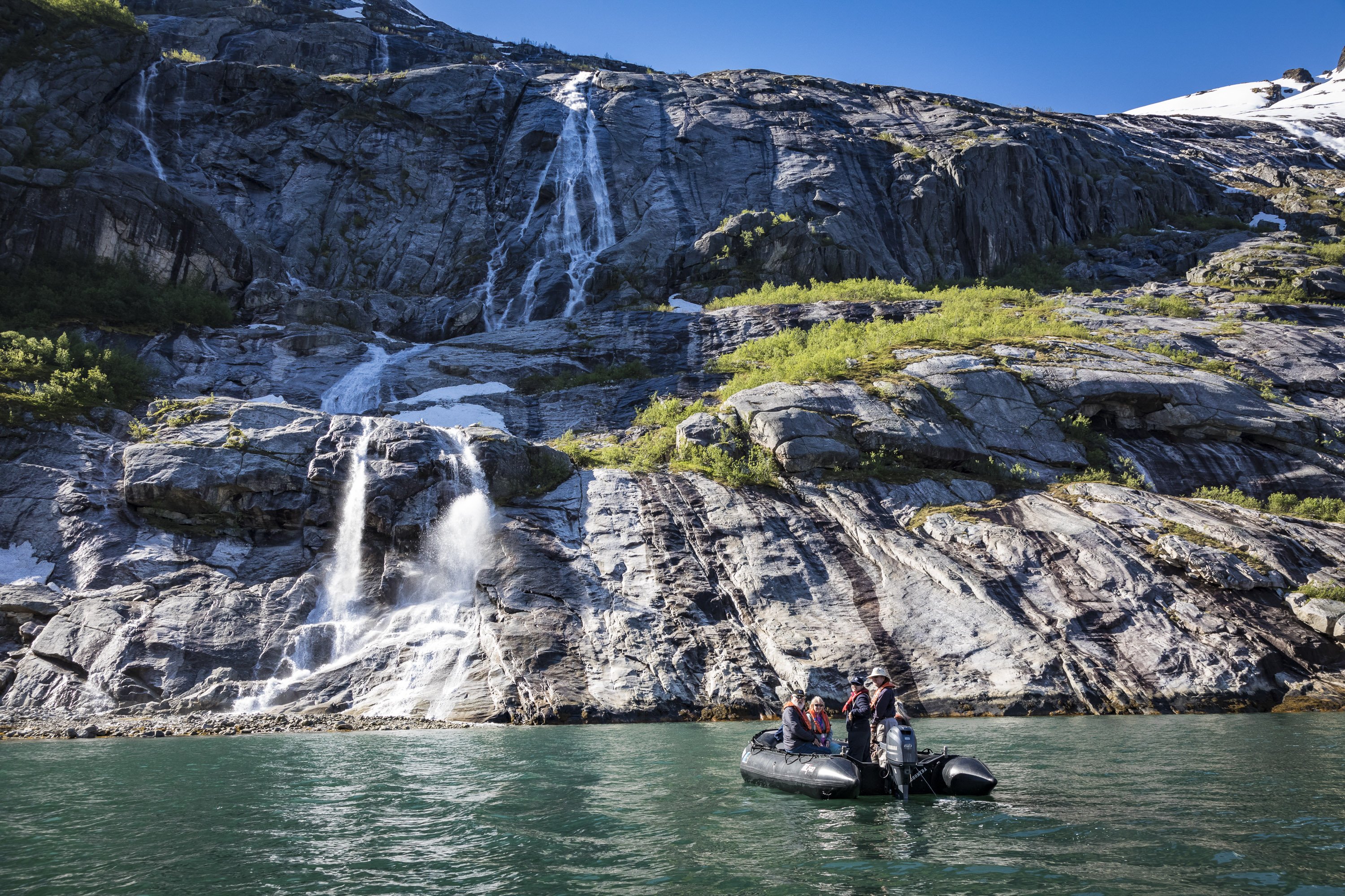 We woke up to an absolutely beautiful day in Nordfjord and chose between a Zodiac cruise or kayaking. On both we saw young harbor seals and an abundance of tall wispy waterfalls created by melting glaciers, cascading hundreds of feet from high on the fjord walls. Upon return to the ship we were greeted by a delicious barbecue lunch on the aft deck. Then Captain Martin Graser decided the deck needed a wash and some of the guests needed a shower so he steered the bow under a giant waterfall in Melfjorden. On the way out of the waterfall we encountered a pilot whale that spent a good bit of time diving under the ship and spraying rainbows with its blow hole. After dinner we visited a cute and very little village called Husøy in the Træna Archipelago to celebrate crossing the Arctic Circle.