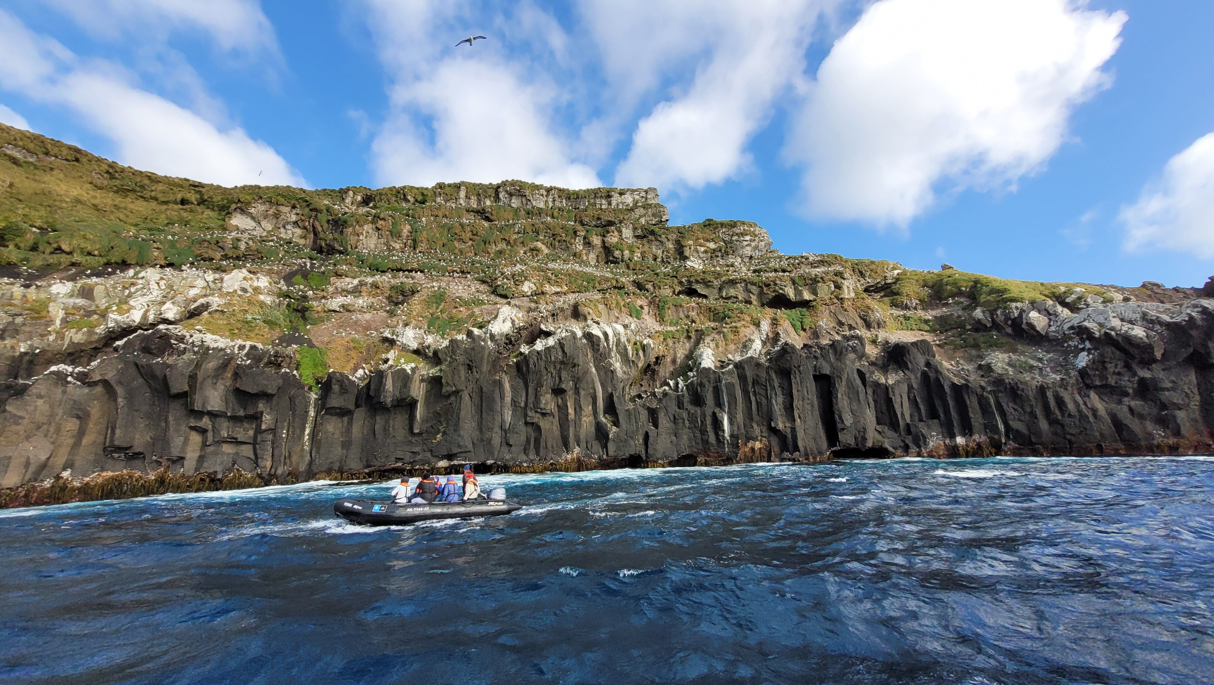 Leaving Perseverance Harbour just before breakfast, National Geographic Orion headed towards the northeastern end of Campbell Island. Our plan for the morning was to Zodiac cruise along the beautiful coastline teeming with wildlife. Campbell Island is an extinct volcano with terraces and cliff faces comprised of basalt from past volcanic eruptions that date back over six million years. The island is home to several endemic species of birds, including two albatross species that nest almost exclusively on the island. The first is the southern royal albatross with a 3.5-meter wingspan, and the second is the Campbell albatross which nests solely here on Campbell. Though smaller than its larger cousin the royal albatross, the Campbell albatross is no less magnificent. Campbell albatrosses nest in very dense colonies along the rugged coastline, and observing the colonies is always a powerful experience. This morning was no exception.