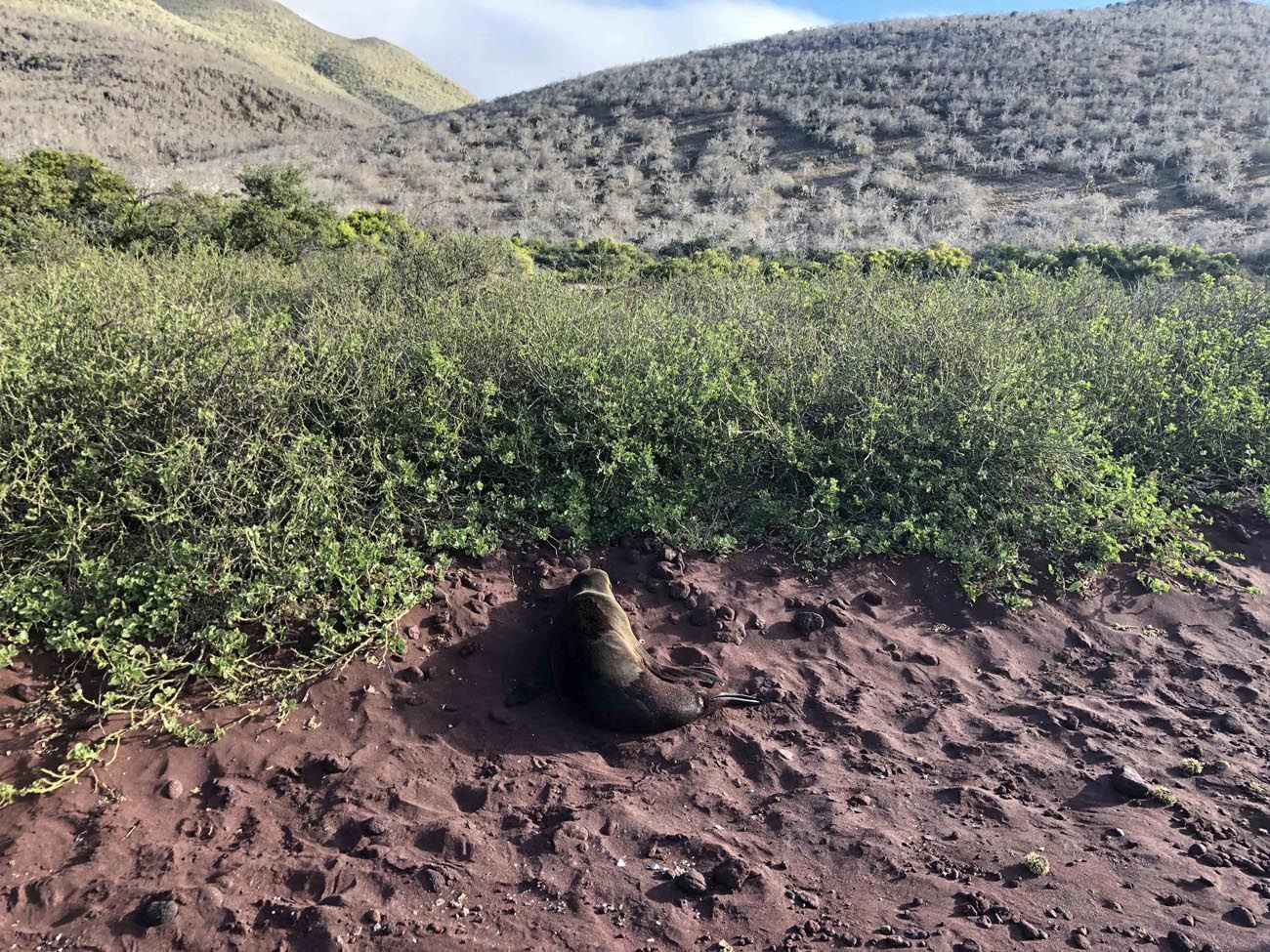 After lunch, guests enjoyed a talk about Darwin in the Galapagos. After which, we disembarked to explore the marine realm of Rabida Island. Guests in search of snorkeling tips went to the red sand beach shallower snorkeling, with others opting for the deep-water option. At Rabida, we observed white-tipped reef sharks, the top predator of the marine food web. We also observed some mating behavior of the Galapagos fur seal. Two adult fur seals were chasing each other, moving round and around in circles as we watched in awe. Guests also experienced the joy of swimming with curious and playful Galapagos sea lions.