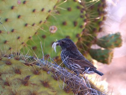 As we walked along the rocky terrain we also found Galapagos land iguanas, some of which were feeding on prickly pear cacti. Some small land birds, such as the small-beaked ground finch, were also looking for nesting material and getting ready to start building their future nest on the bushes. We saw all this activity as the rainy season is just at its very beginning.