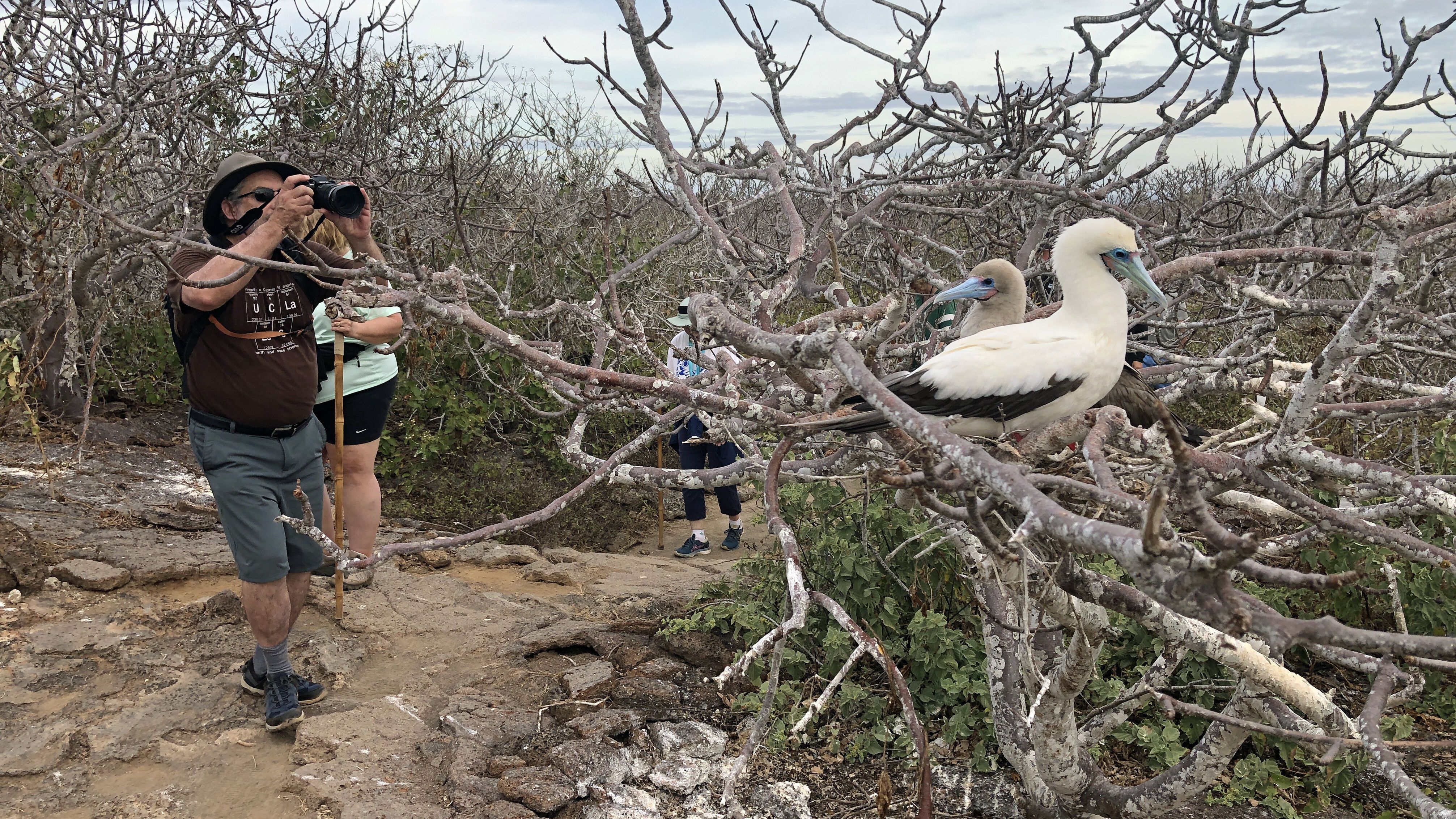 The first full day of our expedition took place in the central part of the archipelago; on the northern side of Santa Cruz Island, we visited North Seymour. This island is small but full of life. Its wind-privileged position and flat grounds have made this place the perfect spot for bird nesting. Our hike looped around the island, showing us the inside of the incense tree forest and then the sandy shoreline. This walk offered everyone the opportunity to see the famous blue-footed boobies in all different stages: from adults that were performing their courtship ritual, to juveniles ready to depart for their life journey. We also witnessed the nest building and displaying of frigatebirds. The male frigatebird’s large red pouches fully inflate to attract females, giving a show of color and contrast. Our groups also met the land iguanas, snakes, and playful sea lions by the shore of this beautiful island.