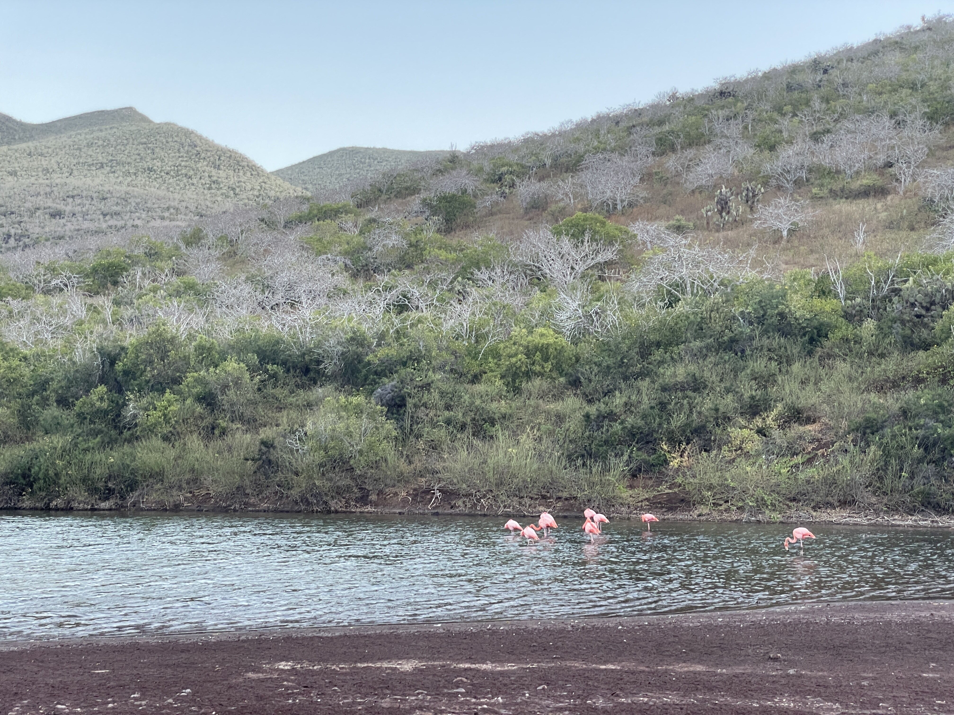North Seymour Island was busy this morning with blue-footed boobies courting and incubating eggs, land iguanas still sluggish and trying to warm up for a day of activity, and male frigatebirds hoping to attract the attention of a mate with their balloon-like gular sacs fully inflated. We then set sail for a couple of hours to Rabida Island, where we had our first snorkeling and kayaking session of the trip. The late afternoon was spent enjoying a stroll along the beach where playful sea lions returned from the sea and landed on the beach, captivating our attention. Further along the beach, we turned onto the trail that led to a lagoon and were rewarded with a small flock of flamingos.