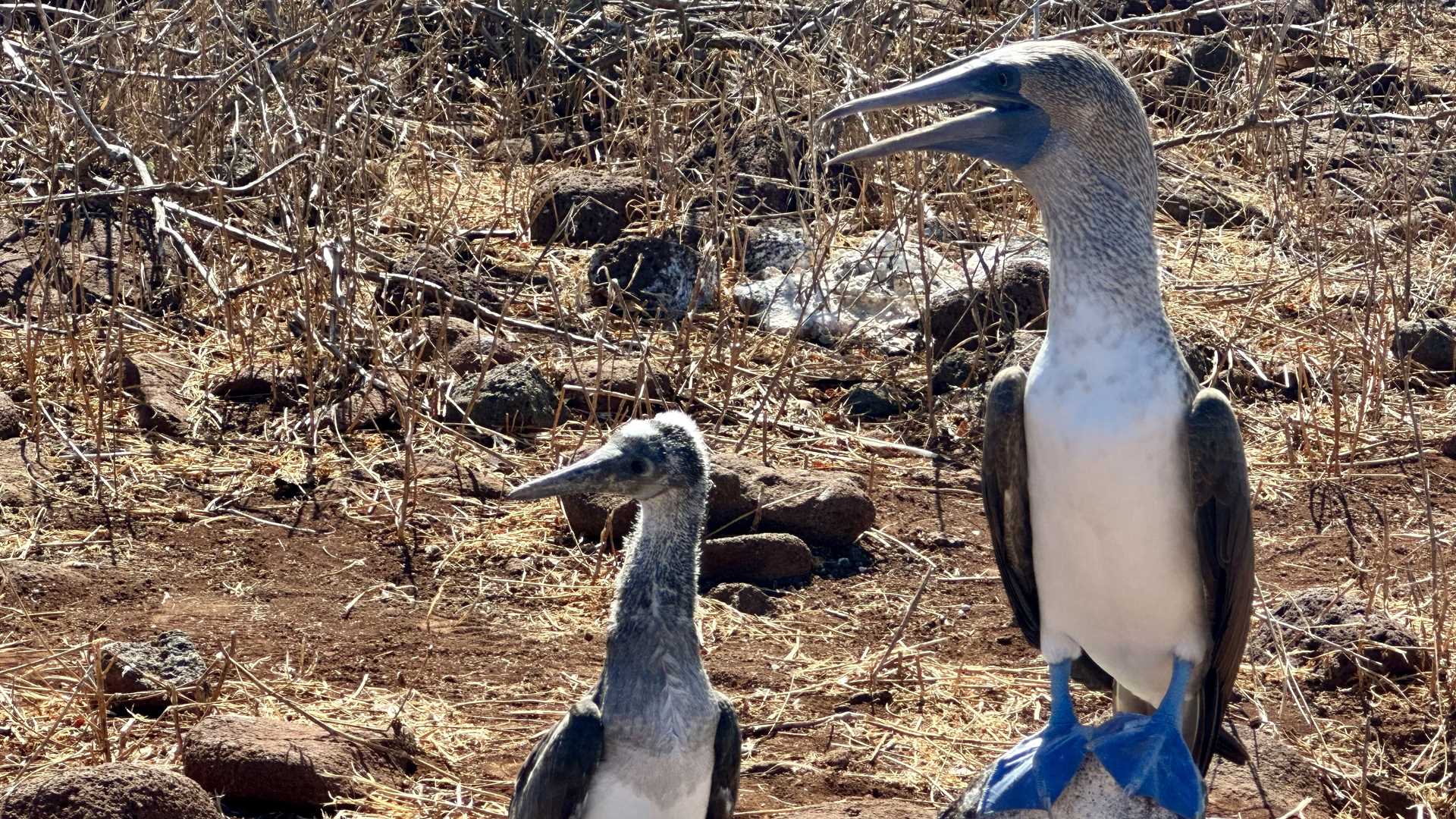 Photo caption and photographer: An adult blue-footed booby with a juvenile. Photo by Franklin Ramirez