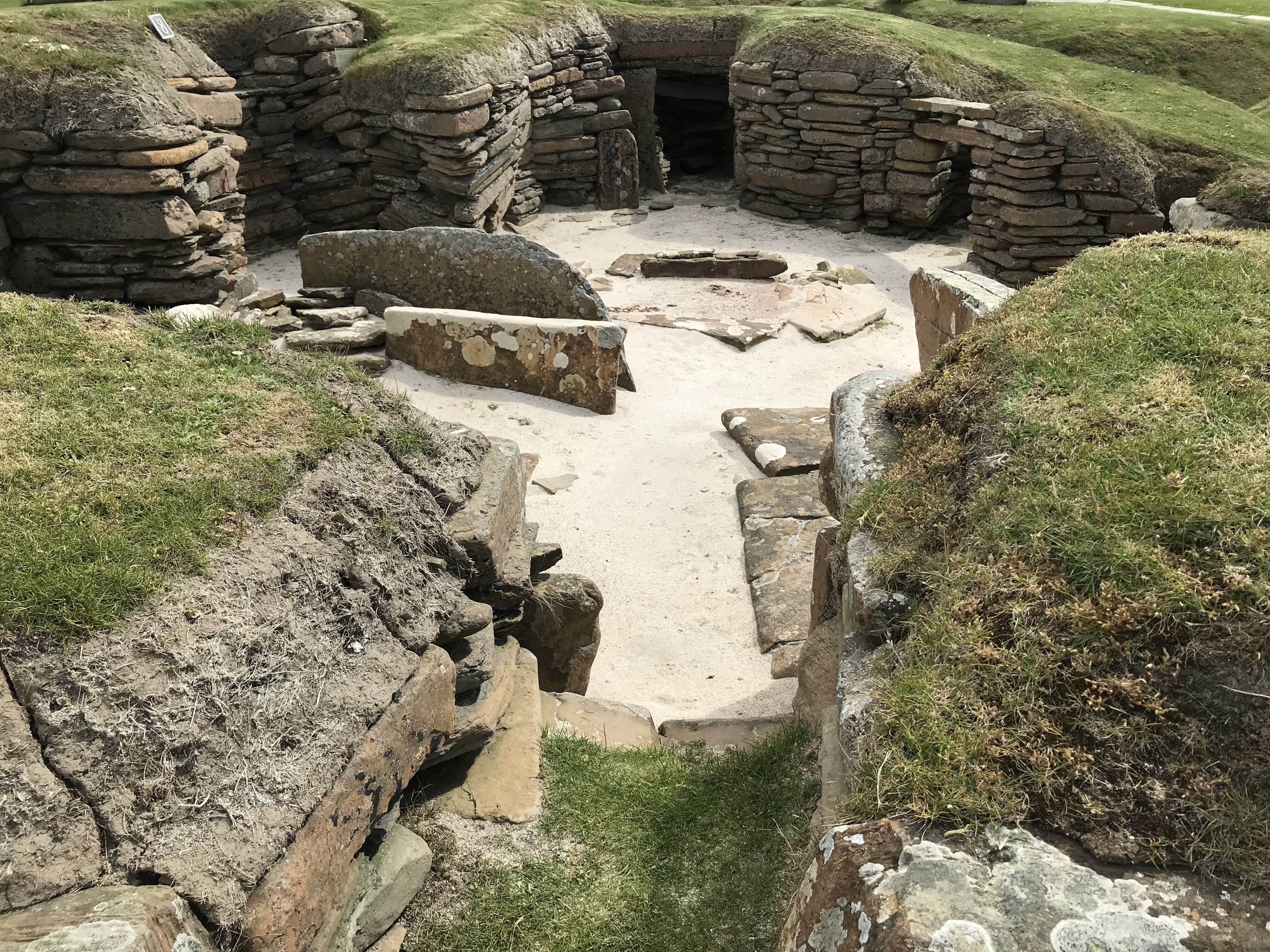 The neolithic heart of Orkney, UNESCO World Heritage inscribed, abounds in monumental archaeological sites. Skara Brae is a remarkably intact village that was exposed by a storm in 1850. Its stone houses survive, complete with stone furniture, including beds, dressers, and hearths. These houses were inhabited by Stone Age farming people for 600 years between 3100 BC and 2500 BC. The contemporary Ring of Brodgar originally comprised 60 standing stones in a wide circle within a henge defined by a deep rock-cut ditch, part of a complex of monuments that dominate the landscape in this part of Orkney.