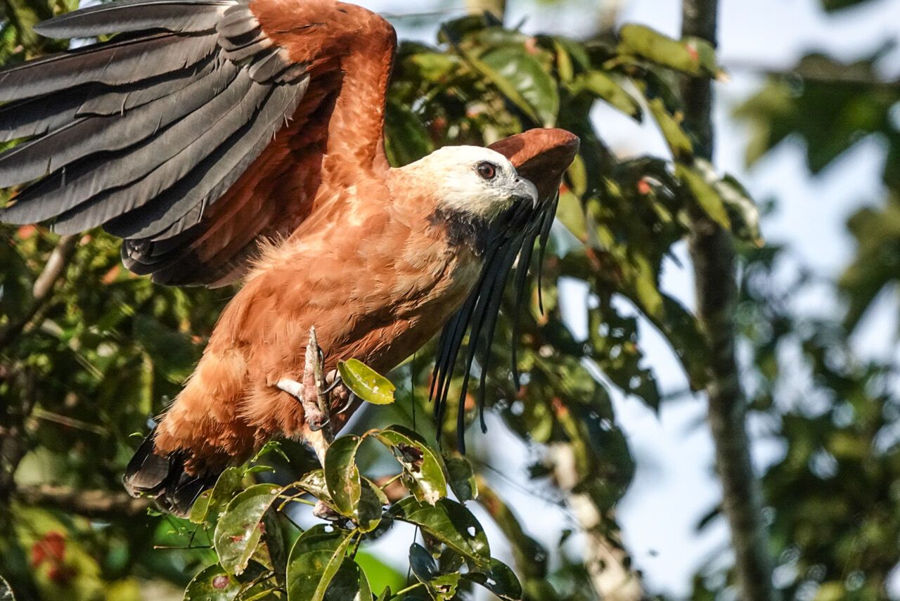 As we moved upriver in the cool morning tropical air, we were serenaded by the black-capped donacobius, horned screamers, and ruddy pigeons. The black-collared hawk is ubiquitous, but we continue to enjoy our sightings every time we find one. Fishing is a morning activity, and we met a woman in her canoe as she cleaned her family’s breakfast, or maybe their lunch. Her catch included peacock bass and red-bellied piranha.