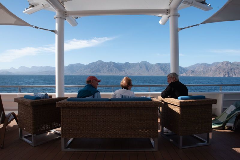 Around lunchtime, whale expert Conor Ryan announced that there was spectacular whale activity happening out in the Antarctic Sound. Guests could see at least a dozen minke whales, a big group of small type-b killer whales, and fin whales—all together and along both the bridge and the ship’s bow.
