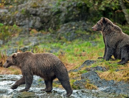 We had some practical drills on board and then were dazzled by talks on photography and Pacific salmon and bear forests by knowledgeable staff members. After lunch, we gathered our rubber boots and rain gear as well as slinging photography equipment around our various appendages and made way out into expedition landing craft to explore a salmon stream where bears were spotted fishing. The two bears, one dark colored and the other a lighter blondish color, struggled for territory over the waterfalls, home to fish breeding grounds. The lucky bear got a catch and made his way into the forest to eat his catch while the other bear walked around close to the group and one lucky kayaker. It was a spectacular first day out in the temperate rain forest of Alaska!