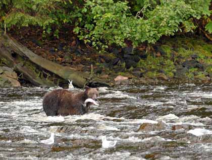 During the salmon spawning season (mid-July until October) about a dozen bears share this picturesque stream, fishing for fatty protein-rich salmon to sustain them through their winter’s sleep. Flocks of mew and glaucous-winged gulls produced a raucous and discordant cacophony – the perfect backdrop for this wild Alaskan scene. Pink or humpy salmon wriggled in the shallows attempting to fulfill their destiny at a spawning site, while leaping silvery salmon bodies (likely sockeye) flashed against the white foam of the waterfall, leaping upward into a succession of pools in hopes of reaching the lake. Four of the five species of Pacific salmon spawn here in Pavlof Creek (pink or humpy, sockeye or red, coho or silver, chum or dog). Dolly Varden and steelhead salmon are reported to be here as well. This is a well-used fishing ground for bears, birds and humans.