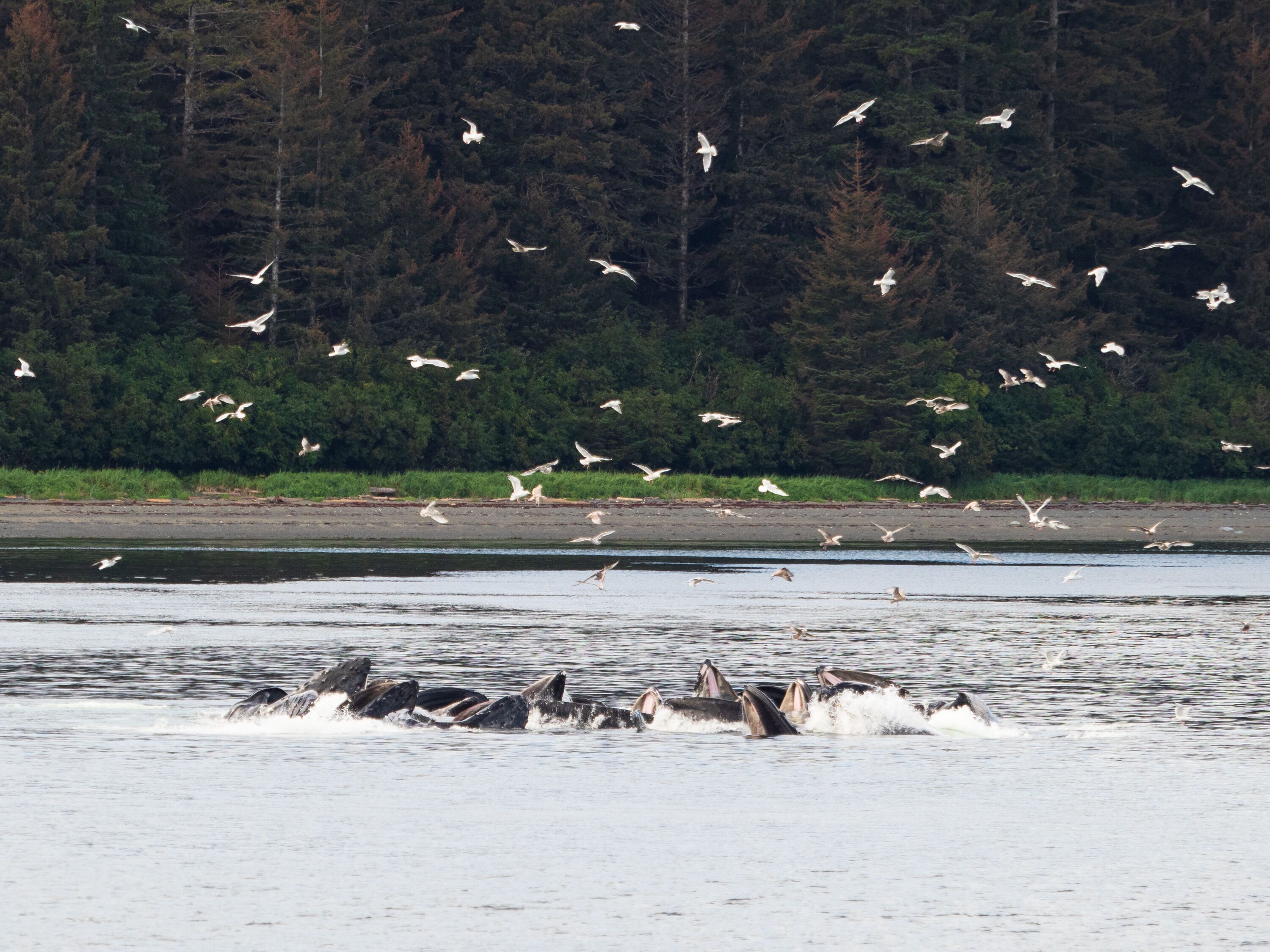 In the early morning, guests set out to shore to stand by a waterfall known for its gifts of salmon. The late summer run of these majestic fish all but guarantees that the brown bears in the area will come to feast, and so they did. A lively pair arrived. They splashed in the shallows and searched for fish to fatten up for the cold Alaskan winter as they entertained our guests with their antics. Leaving the bears to the hunt, we set out in the afternoon in search of more feeding adventures but this time with a larger mammal in mind. We were not disappointed and found a host of humpback whales bubble-netting in unison to scoop up a bounty of herring.
