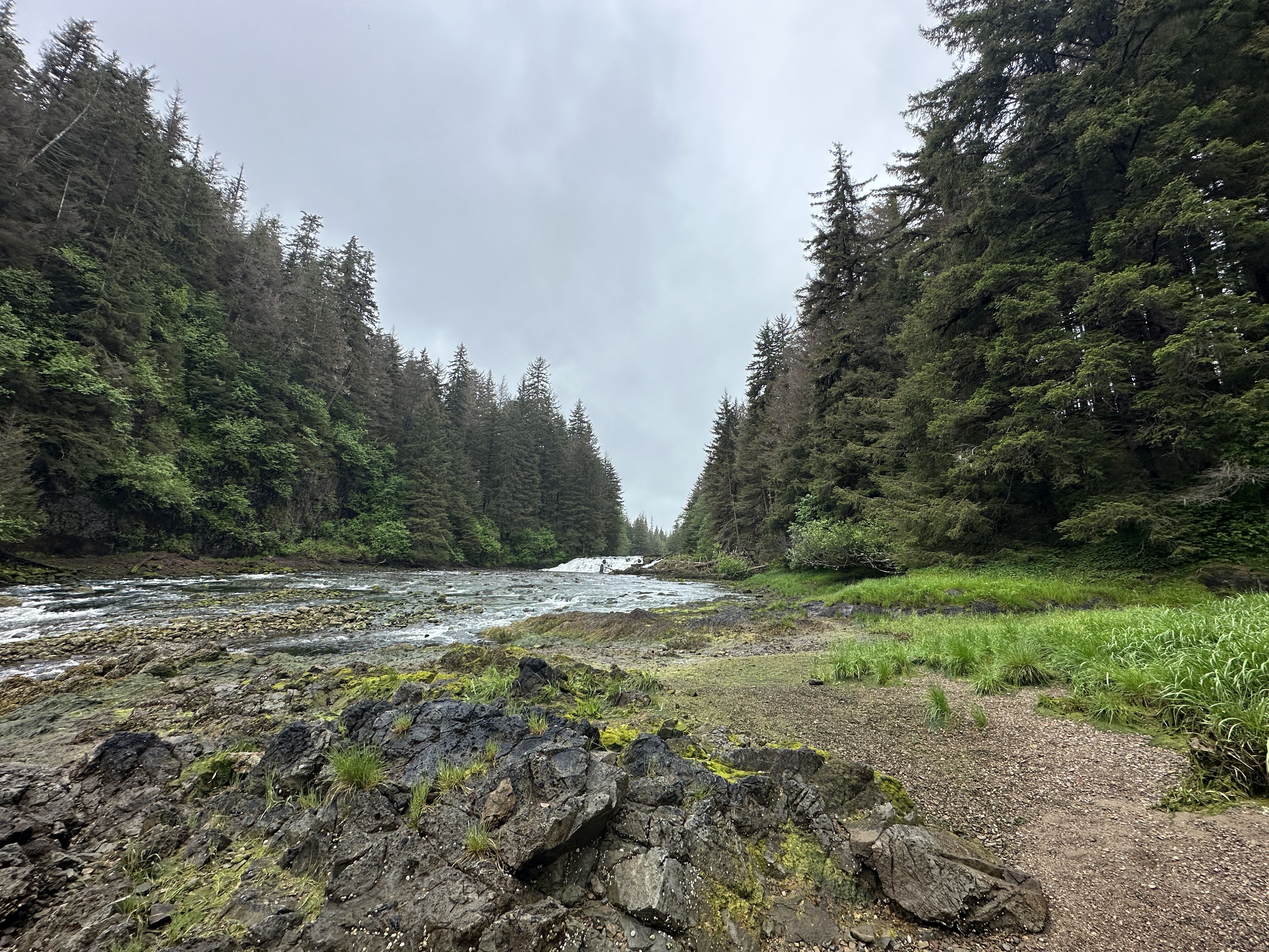 We arrived at low tide, so the beach was covered with rockweed and sea stars. We met Pavlof River where it empties into the ocean, and we walked along the water’s edge until we reached a roaring waterfall. From there, we plunged into the forest for a wild hike through the temperate rainforest.