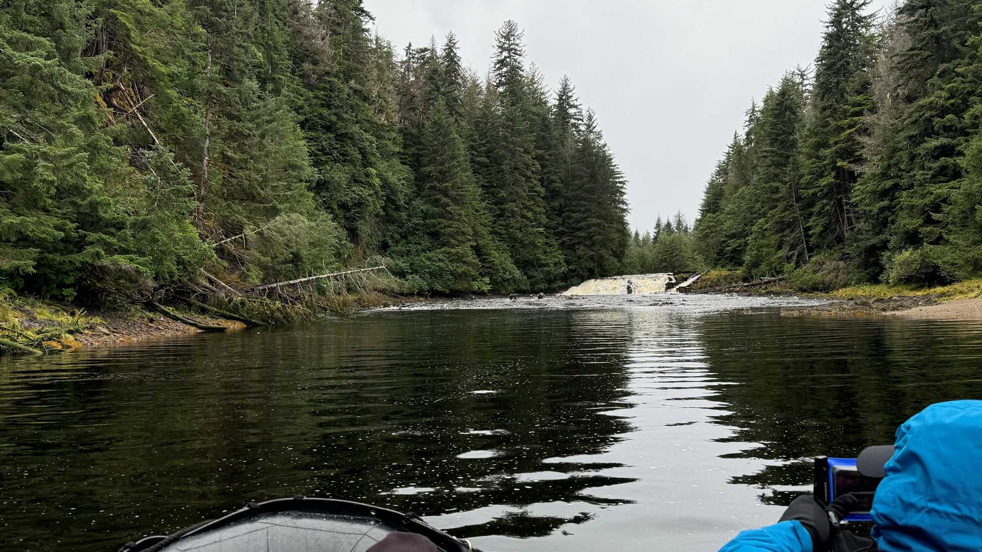 This 29th of August was an exciting morning followed by a relaxing afternoon. Cloudy, drizzling at times; we are getting used to the Alaskan weather and appreciating our raingear. This morning we took Zodiacs into the salmon creek at Pavlov. I counted six bears before loaning my binoculars away — I overheard a guest count seven! We witnessed a mother bear nursing her yearling mid-stream; she then caught a salmon and shared it with the cub. The second group’s guide told me she caught a salmon and took it to the cub, who promptly lost its grip and the wounded fish got away. Mom didn’t notice, as she was back to fishing already. After viewing, my group took a short but lovely walk along the stacks of Wachusett Cove. These rock pillars are tall columns with bonsai-like spruce and hemlock growing off the tops. The caves and arches were fun to walk through. We then ducked into the thick forest to find a huckleberry bush loaded with berries. Sometimes they are too tart, but these were delicious. Late summer is berry season. Our afternoon was spent cruising for wildlife and stopping at Kasnyku Falls. Cocktail hour and interesting recaps await us; a very nice finish to a memorable day.