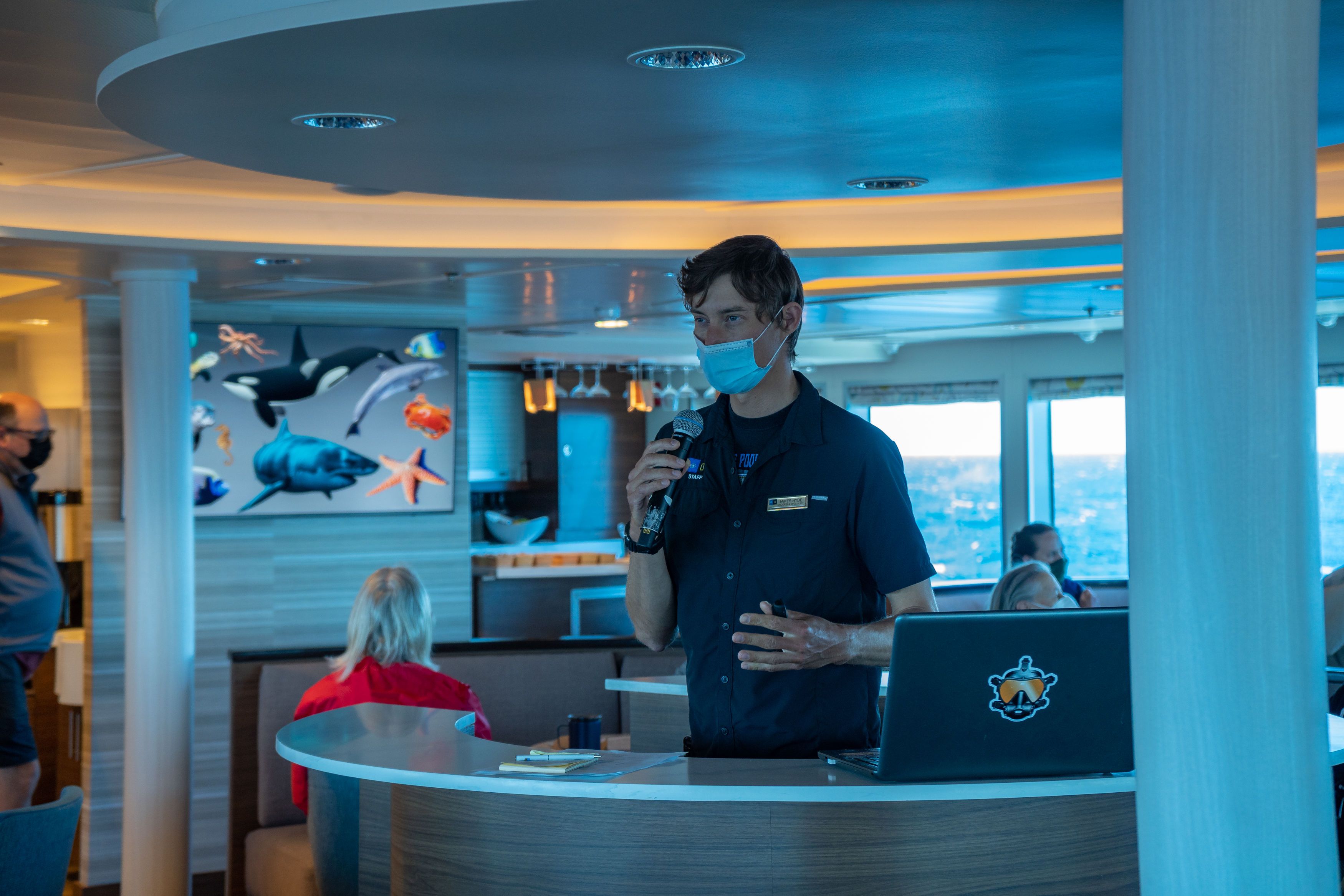 After three wonderful days in New Zealand’s Subantarctic Islands, we are making our way south to Macquarie Island, within the Tasmin State of Australia. Macquarie is a UNESCO World Heritage site, namely for its fascinating geology. The intact seafloor was pushed above sea level by mid-oceanic convergence to form the island. The same ridge that produced Macquarie Island also creates ocean currents that generate biodiverse hotspots, and we were greeted with evidence of just that this morning. During breakfast, we spotted several whale blows in all directions around National Geographic Endurance . We sighted two southern right whales, one of the rarer cetaceans in the Southern Ocean, and numerous sei whales. We were also escorted by a large pod of long-finned pilot whales. The large males and pairs of mothers and calves were just off the bow. They had large, round, shiny heads, white blazes, and beautiful saddles. It was truly a treat to watch them effortlessly move through the water as a unit before disappearing together in one fluid dive. We had two lectures by the photo team. One helped us better understand the phone in our pockets, a.k.a. our smartphone, and the other helped us improve our bird photography. Next up was a lecture on the smell of the ocean by naturalist Conor Ryan. We learned how birds find dense prey aggregations in the vast ocean they call home. The seas were relatively calm, and the fog came and went throughout the day. Albatrosses soared along effortlessly as we moved toward our next destination. The air is getting noticeably cooler. Soon we will lose sight of the vegetation we have been enjoying along with the milder temperatures. We are getting ever closer to the Ross Sea. We are getting closer to Antarctica.