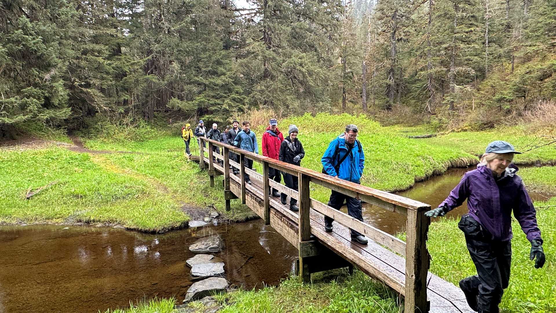 Guests aboard National Geographic Quest began their Alaskan adventure with breathtaking scenery at Fish Bay. As the sun peeked through grey, drizzly skies, the bay was calm and surrounded by foggy mountains. Sea otters made a delightful appearance, gently backstroking past the ship, while Sitka black-tailed deer grazed along the shore. Ravens and eagles flitted between treetops, creating a stunning backdrop for a morning stretch with Allison on the sun deck.