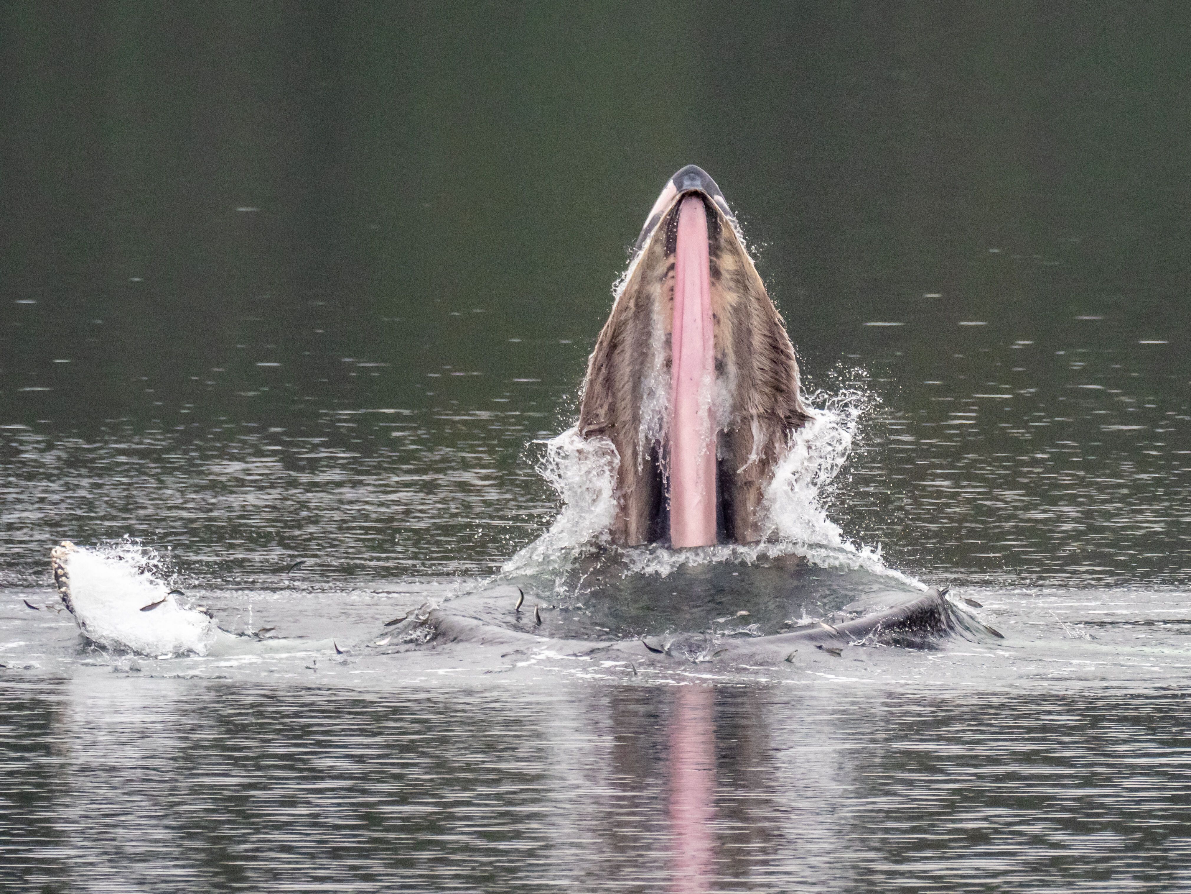 After a foggy passage through Sergius Narrows, National Geographic Venture was making a scenic trip through Peril Strait when a humpback whale was spotted. We came to a stop to see what this whale was up to, and what a great choice that was. The whale was blowing bubbles in a circle underwater for over two minutes. These bubbles rose to the surface in an ever-constricting net, and then the whale burst to the surface, mouth agape. Herring were seen leaping into the air, some escaping, while many more went into the mouth of the whale. We watched this incredible show of intelligence quite a few times. We were amazed by the perfect circles and the beautiful pink inside the mouth of the whale.
