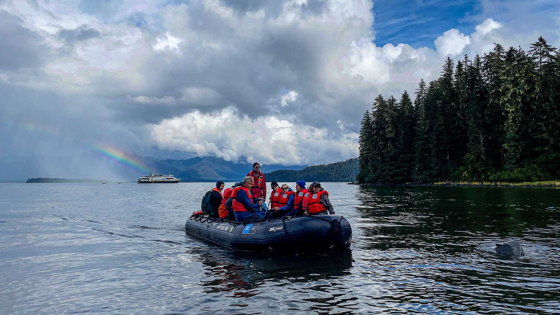On the last full day of our voyage, we woke in Endicott Arm near the Dawes Glacier. We spent the morning enjoying Zodiac tours to the face of Dawes Glacier and watched multiple calving events. We were also able to spot several harbor seals, waterfalls, and a couple harbor porpoises on the way. After lunch we had the opportunity to participate in a polar plunge. Forty people decided to brave the frigid water for a short swim. Those of us not eager to jump into glacier water were able to watch from the bow. After the polar plunge, we warmed up on board as we started transiting towards Juneau. On the way, we stopped at a beautiful waterfall to once again admire the amazing natural beauty of Alaska. During our farewell recap, we were treated to a quick visit by a humpback whale. We ended our day with a slideshow made up of our favorite photos and memories of an amazing week on board National Geographic Quest .