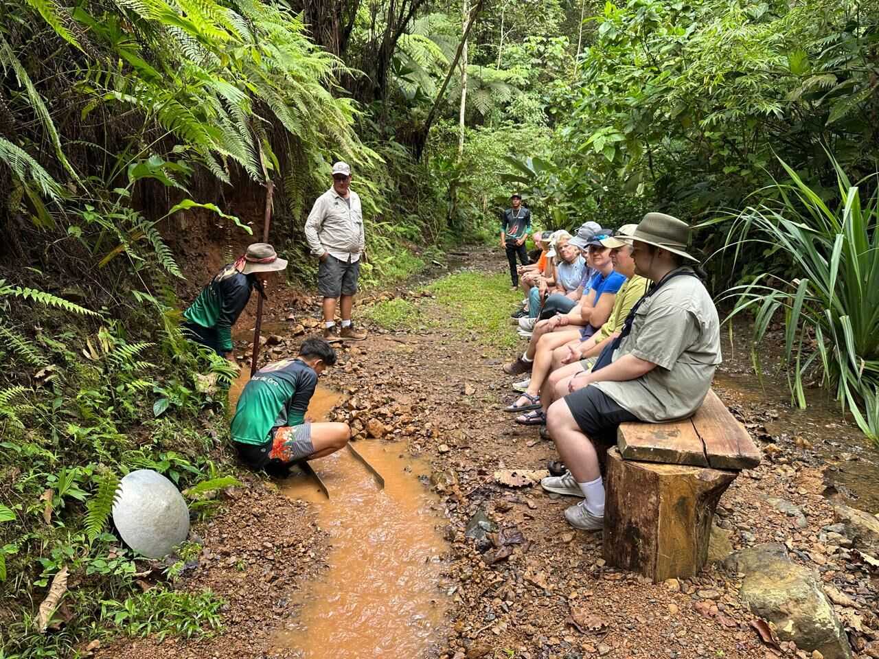 An amazing day of cultural experiences was had by all as we explored the many facets of Playa Blanca in Gulfo Dulce today. Using Playa Blanca as our “hub,” we visited several families and their farms and businesses. We enjoyed panning for gold at an artisanal mine, long treks through the Danta Rainforest, a barbecue lunch at Playa Blanca with youth presenting local dances, and visits to a sugarcane mill, the Finca Kobo chocolate farm, and Mrs. Eida’s hearts of palm plantation. Everyone returned to National Geographic Quest well-fed and full of great stories from our day ashore.