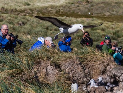 Early in the morning and with a sunny morning, we headed Zodiacs to visit South Plaza Island, which is located at the Northeast of Santa Cruz. Despite South Plaza being small, it is home to a large number marine and land iguanas. Just a few meters from the landing jetty, we observed many of them warming their bodies on the rocks, making their nests or feeding on cactus, while along the shallows a great number of playful sea lions jumped and swam under the attentive sight of a big male. Walking along the flat rocks, we arrived to the steep banks where we observed a great number of birds such as red-billed tropicbirds, swallow-tailed gulls, shearwaters, Nazca and blue-footed boobies. Probably the most exciting part of the visit was when we observed two big Galápagos sharks swimming close to the surface, along the islets.