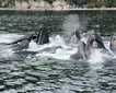 Our last day in the Great Bear Rainforest proved to be one full of excitement, education, and awe. After dropping anchor in the idyllic glacial fjord of Green Inlet, we set out to explore the rocky shoreline and forested granitic fjord walls. The dense fog gradually turned into a wispy mist, which exposed different peaks and valleys of the forest as it moved through. We took turns kayaking through a delightful cove that was loaded with ochre sea stars, rockweed, and blue mussels so thick and dense that the rock they were attached to was hardly visible between them. A river otter scurried along the shore and bald eagles soared above us. From the Zodiacs we visited nearly a dozen thunderous waterfalls that were running hard and fast from the heavy overnight rains. We observed harbor seals observing us back; they were quietly periscoping their furry heads up and out of the water as we approached the rapids where they were hunting salmon making their final journeys upriver to spawn. Upon our return to National Geographic Venture , expedition diver Nick Brown shared his extensive underwater video footage from the area. His presentation was interrupted, of course, by whale sightings, which we rushed onto the bow to appreciate.