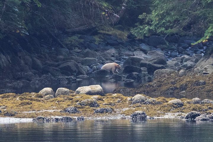The fjords of the Great Bear Rainforest rarely give a free pass without an excess of humidity. But today, what appeared to be a light rain quickly proved to be a mere bit of seasonal dew. Today’s destination was an island known for its population of bears with a very exclusive set of genes. These bears, described by William Hornaday for his friend Frank Kermode, belong to the only population of American black bears on Earth that contains a small subset of all white, non-albino individuals — the spirit bears. As we were preparing to load our Zodiacs for the first round of hikes, we were surprised by an announcement from the bridge: a spirit bear had been spotted at the mouth of the river that we were to hike along. Since sightings of this mythical beast are so rare, all preparations were put on hold, so that as many guests as possible could view this ghostly being from our bow. Once the white bear had faded from sight we resumed our debarkation. When we arrived at the viewing platforms, we found ourselves at the edge of a stream that was full of spawning salmon! Immersed as we were in this land of life and death, our allotted time slipped by in a flash. Returning to the ship, we began cocktail hour, only to be treated to an amazing display of group bubble-net feeding by the local humpbacks! It simply does not get any better than this! Photographers: Jeff Campbell, Naturalist , and Alex Joseph, Certified Photo Instructor
