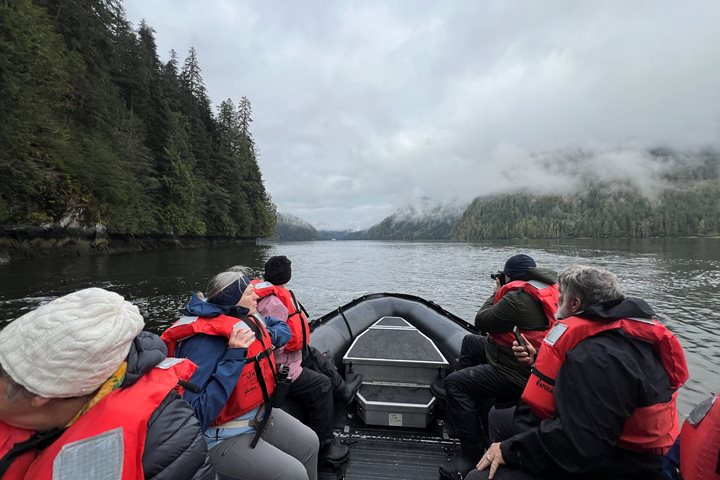 Our day began with a thrilling Zodiac cruise through the serene waters of Kitasoo Xai'Xais Territory, where we marveled at stunning waterfalls cascading into tranquil fjords. The morning's calmness was perfect for kayaking, allowing us to glide through reflective waters and soak in the peaceful beauty of the landscape. After lunch, we ventured into the surrounding channels in our Zodiacs, scanning for wildlife. We were rewarded with sightings of seals and seabirds in their natural habitat. The highlight of the afternoon was a visit to the historic, abandoned town of Butedale. The contrast between the ghostly ruins and lush environment was striking, enriched by our guide’s tales of its past. Today’s expedition was a blend of natural splendor and historical intrigue, leaving us with lasting memories of Kitasoo Xai'Xais Territory’s unique beauty.