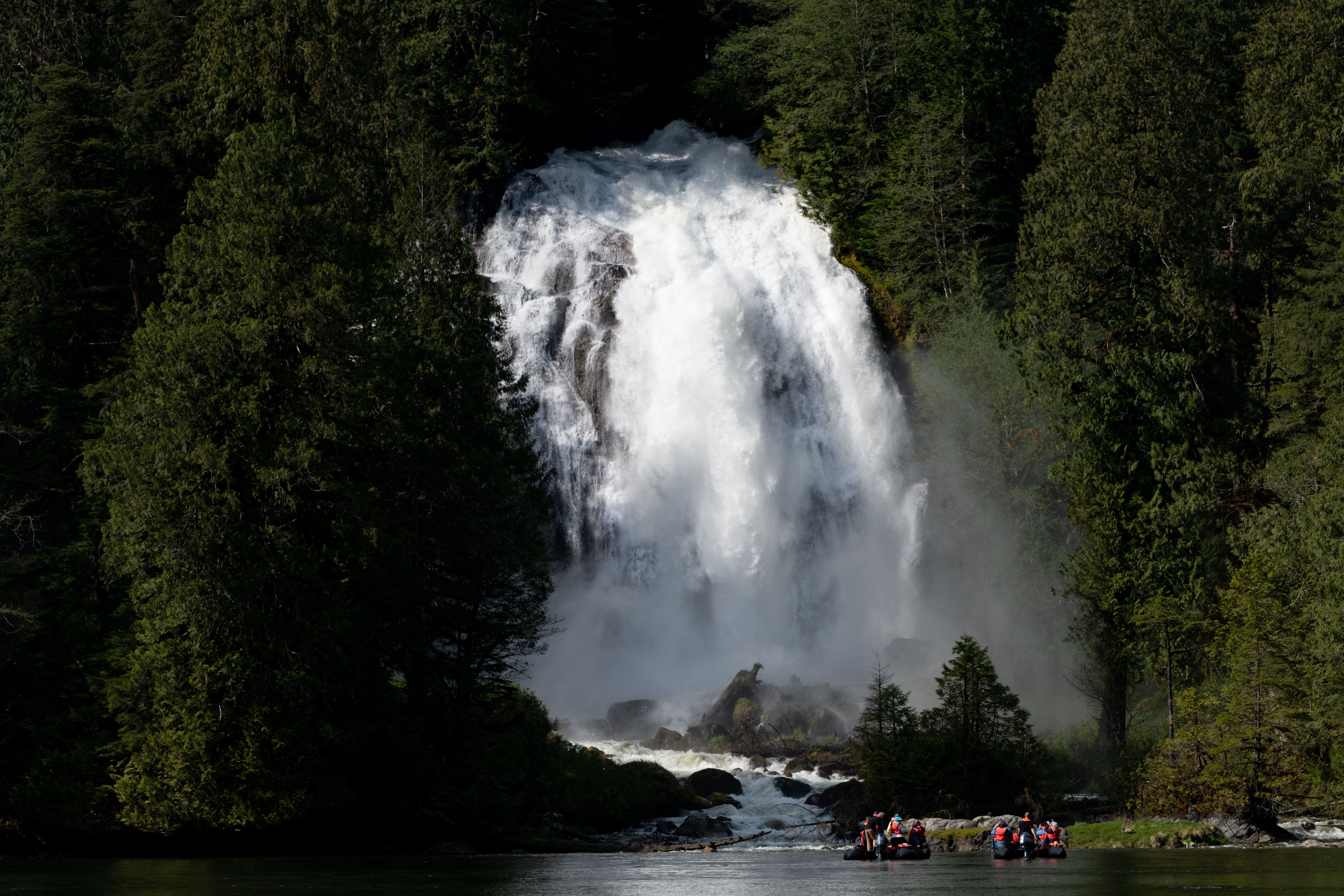 It is a green and white day in Princess Louisa Inlet. In every direction, dividing the carpet of towering cedars into an abstract, vertical patchwork, white ribbons—long, slender, rushing rivulets of recently melted snow and ice––stream from every crack in the near vertical landscape.