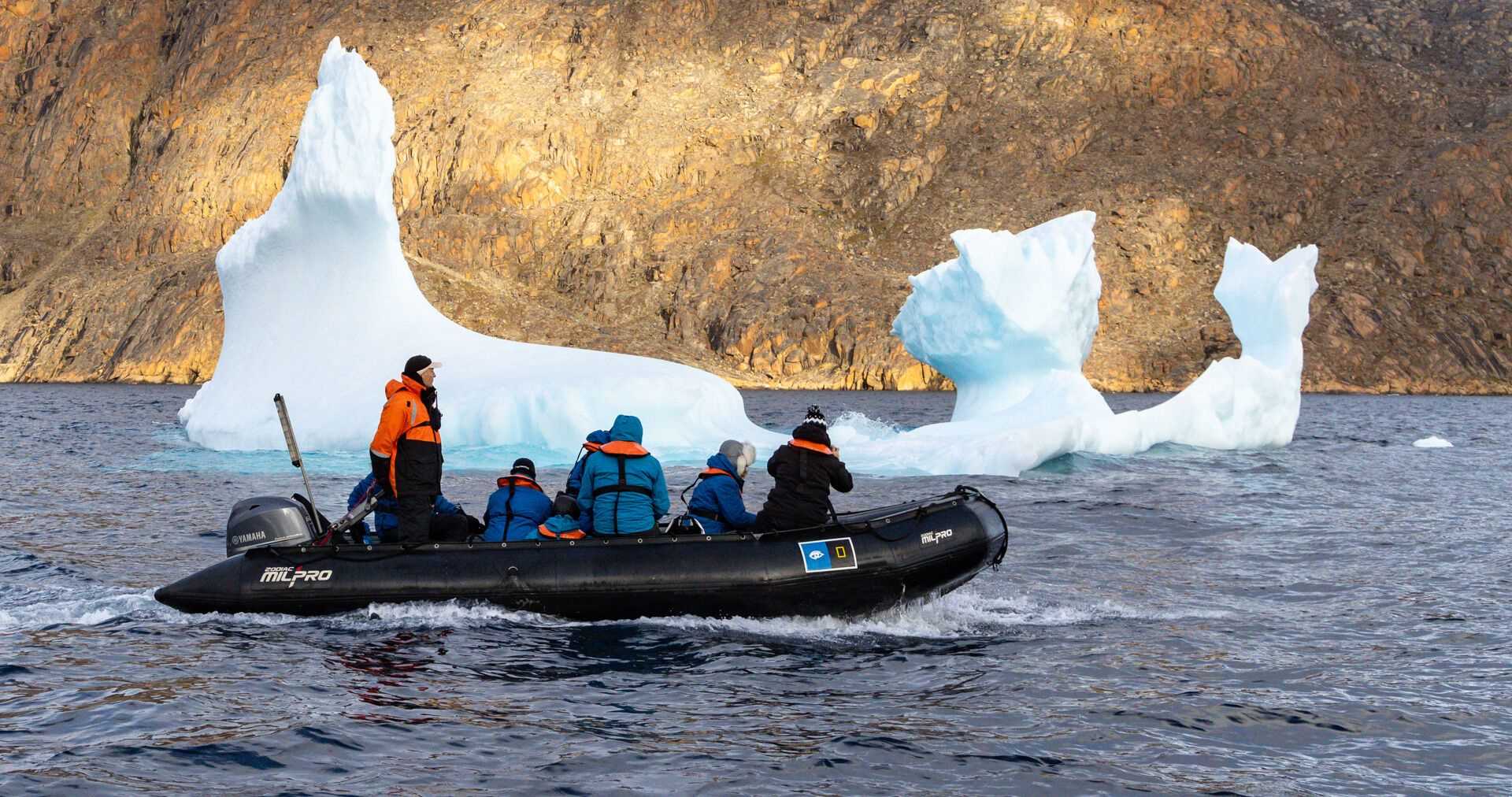 In the afternoon, the ship moved into a sheltered position among several islands as wind picked up. Here, a Zodiac cruise was offered to guests. Around the ship in the distance, several whimsically shaped icebergs were slowly moving southward surrounded by cliffs and steep rocky slopes of nearby islands.