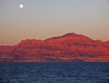 We reached the south end of Isla Espiritu Santo and went ashore for natural history walks. Later, a gorgeous moon rose from the eastern sea.  As we watched, a humpback began to breach.  Then, we were joined by bottlenose dolphins, who swam in to catch a free ride on our bow wave.  A mellow yellow sun dropped below the Baja Peninsula and darkness wrapped us like a soft flannel blanket.