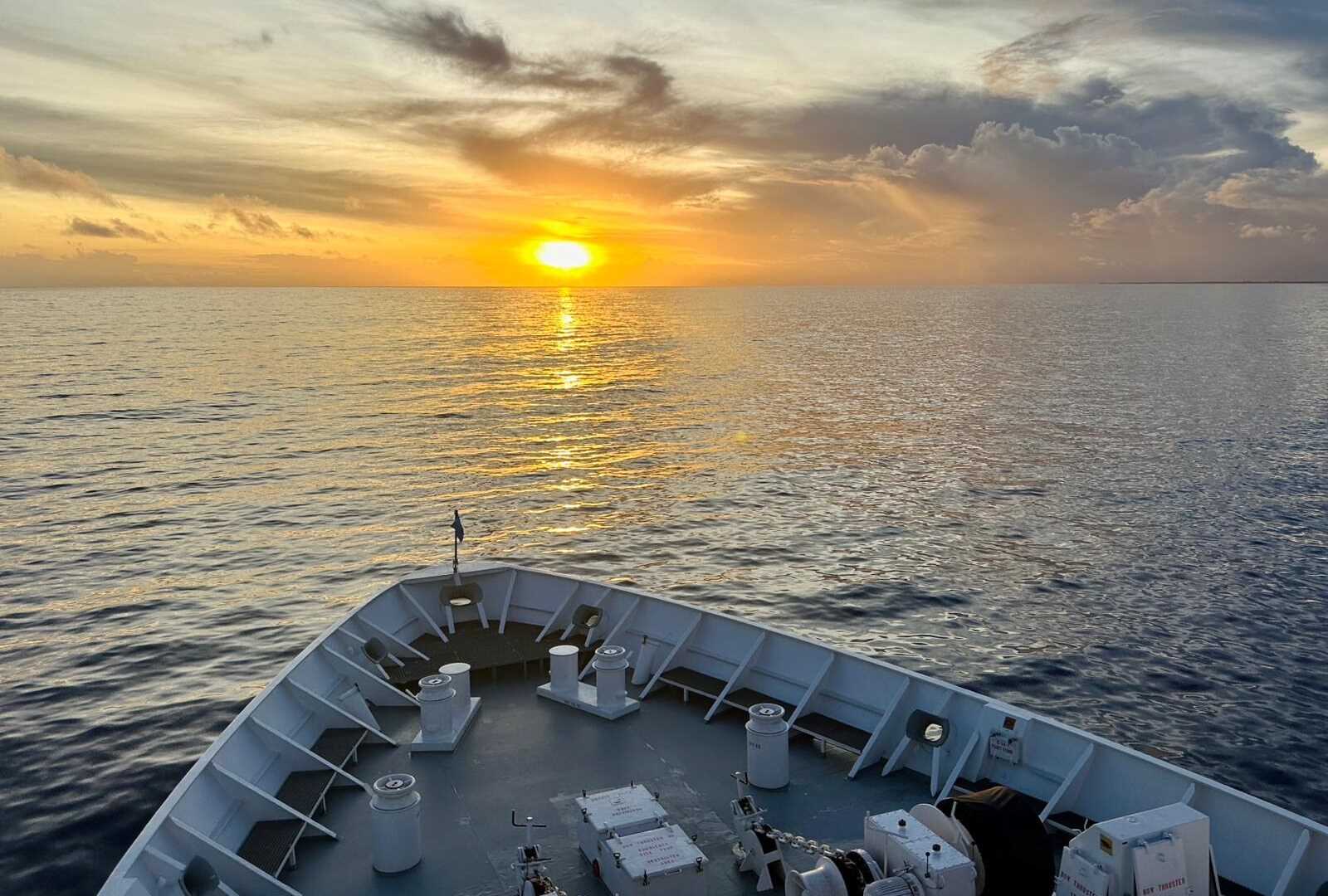 National Geographic Orion arrived in the remote atoll of Rangiroa in the Tuamotus as the sunrise filled the skies with pink and gold clouds. Rangiroa has a 31 square mile turquoise lagoon encircled by palm covered islets and sandbars. It has two main passes, the Avatoru and Tiputa, both located on the northern side of the atoll.