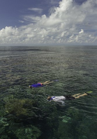 Our morning began with a delicious plunge into the sea from the anchored platform, swimming or snorkeling along the edge of the reef. Once again it was a world-class experience. An amazing variety of corals were crowded the shallows of the reef top and continued down to the sand about 40 feet below, a riot of wonderful shapes and rich colors glowing in the brilliant ripples of sunlight. All around, above, below and within, were bouquets of beautiful fish. “There’s an ornate butterfly fish, and a rabbit fish, and bunch of bright purple anthias!” …On and on as we swam from one spot to another. Best of all we found a small coral tower festooned with anemones and five different species of anemonefish living together in a little palace of diversity.