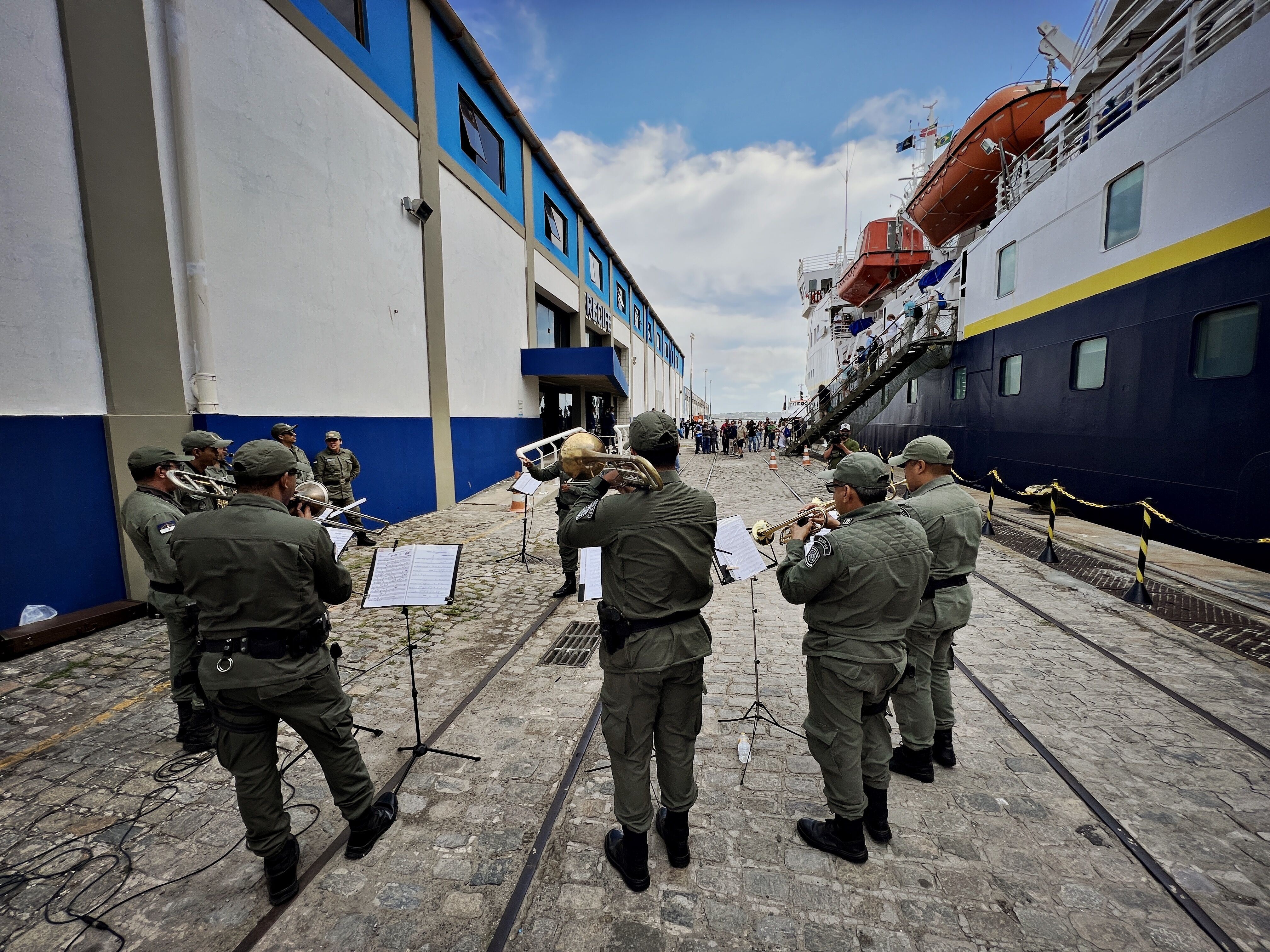Our journey through South America brought us to Recife, the capital of the Brazilian state of Pernambuco and a hotspot for music, culture, architecture, and so much more. We were greeted like celebrities when we approached the dock, where a military frevo brass band welcomed us with festive rhythms played on trumpets, saxophones, trombones, and backed by lively percussion. At one point, a female soldier dressed in army green with a rifle slung over her shoulder provided lead vocals. Frevo, which is a fascinating blend of European brass band marching music and Afro-Brazilian rhythms, is a staple of Recife’s unique carnival tradition, quite distinct from the music to the south in Rio de Janeiro.