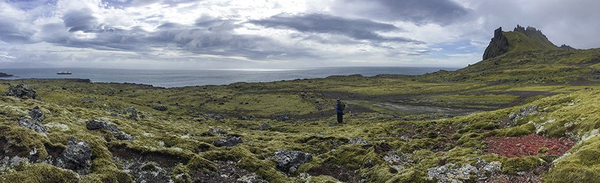 It made a fine prelude to our late-morning visit from Dr. Andy Szabo, director of the Alaska Whale Foundation, who spoke eloquently about the complexity and culture of this beautiful species. Just ahead was the narrow entrance to Red Bluff Bay, starkly heralded by the eponymous red bluff–barren rock surrounded by millions of acres of forest. The ultramafic rock, so rich in iron (hence the red color) and magnesium, creates poor soils and supports only meager plant growth. Inside the bay though, life could not have been richer, and we approached and admired a waterfall pouring down the mountainside.