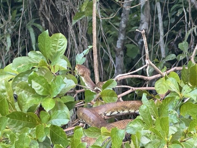In the afternoon, we repositioned to Golfito, anchoring at the Golfito Dock. The outing began with some guests exploring the area by kayaks, while others took a Zodiac cruise. We spotted a Central American tree boa, several seabirds, and a three-toed sloth hanging at the edge of the forest.