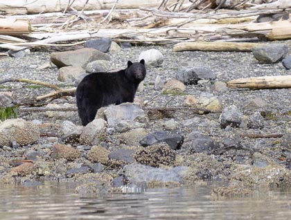 Steaming slowly and ever so slightly north, National Geographic Sea Lion made her way into Blackfish Sound where we could anchor safely, drop the inflatables and spend the remainder of the morning on an extended ride zigzagging through narrow passages heading ever so slightly east into a well protected small bay where the remnants of an old Kwakwaka’wakw village site could be seen from the water. We all headed out, enjoying the early morning light and gorgeous scenery; a mix of small islets covered in temperate rain forest. Casting a watchful eye to all beaches, a large black bear was spotted busily foraging for its breakfast. We approached slowly and watched as this healthy black bear continued turning over quite large rocks looking for muscles and barnacles.