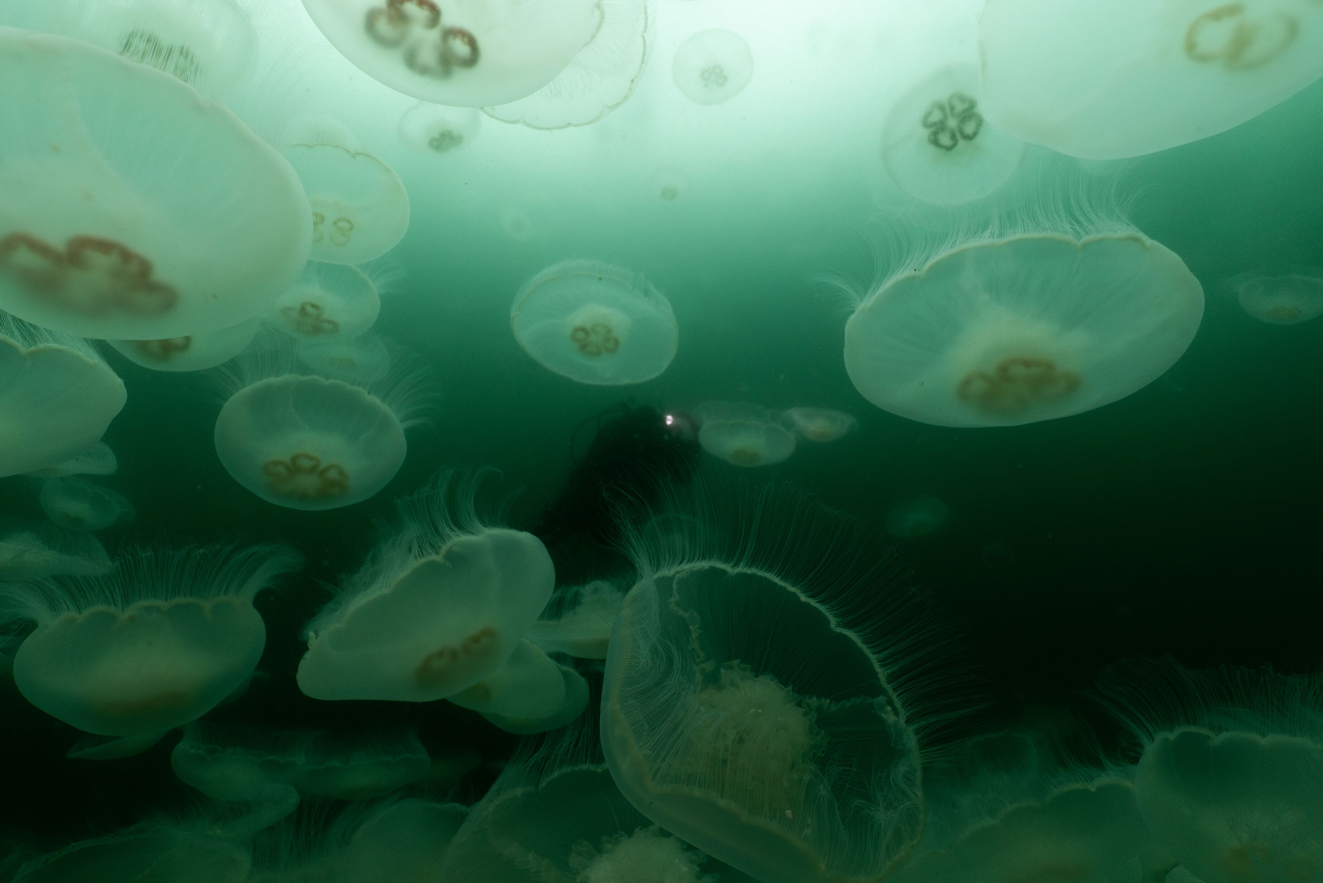 Today, we spent our final morning here in Southeast Alaska in Rodman Bay. The end of this bay features tidal flats and streams good for wildlife viewing. We took full advantage of hikes throughout the area. But it was the plankton that stole the show here- as we looked off the ship, we saw seemingly endless waves of moon jellyfish. These beautiful jellies numbered in the thousands and delighted those onboard. The undersea team embarked on a dive amongst the smack and brought back photos and videos to share with of this aggregation.