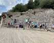 This morning, we woke up in a foggy Romer Fjord. It was a typical fall morning for Eastern Greenland; however, we have been very lucky with sunny and calm weather on almost all our previous days, which is quite unusual for this time of the year. A gloomy vertical cliff exposing layer after layer of flood basalts was on one side of the fjord, and the top of this cliff was hidden in the low clouds. Another side of the fjord was covered with piles of rocks left by an Ice Age glacier. One small hill on that side of the fjord was quite distinctive in color, greener and greyer than the rest of the landscape, which was predominantly brown. As we learned later, a thermal hot spring was running from the top of that hill. A little distance below the top, the spring water accumulated in a pool. Three activities were offered in the morning, including a long hike, a free, ambient walk within a large perimeter, and for the most adventurous guests, bathing in the thermal pool.