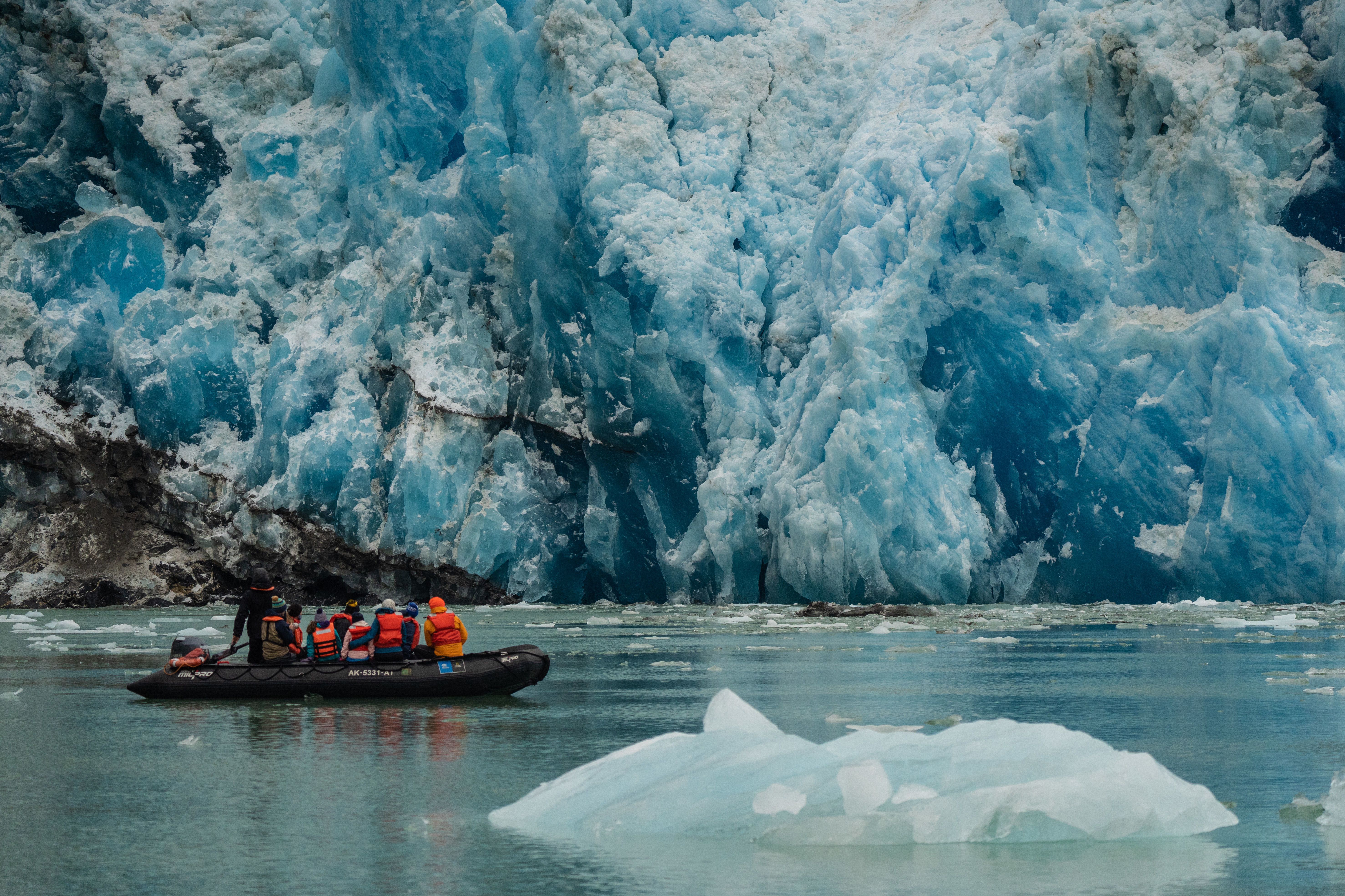 To be honest, it was hard to know where to look: down at the tips of the icebergs with 90% of their mass below the surface, up to the mountains whose summits disappeared into the clouds, or straight into the stunning blue wall of glacial ice ahead.
