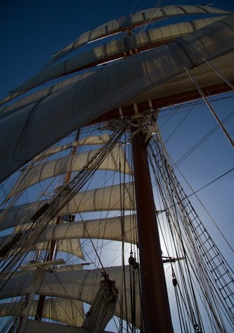 The following winds persisted, though we were trying to outrun them to the north. Stella and Eleni held an informal question and answer session on “All Things Greek,” and then we heard the call for the crew to go to sail stations again. The winds had diminished enough to set the royals, or the upper square sails, as well as the courses and staysails on the foremast, main mast, and mizzen mast. The afternoon light softened, making for the best sailing photography of the voyage. And then suddenly—without explanation—the wind changed. We all looked up at the sails in befuddlement, with the staysails filled, the courses backed, and the upper squares luffing. Captain Komakin let the staysails bring her around and the squares filled again, and we slowly regained a semblance of headway. The wind is funny that way, and we were barely moving when the crew went aloft to put in a harbor furl for the final evening of the voyage.