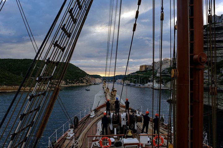 On our first day, our chief office Alexandre Bota gave a first-rate introduction to the sails on Sea Cloud, all 30,000 plus square feet of it. The sailors went aloft and by 10:30 we were breezing along at 6.5 knots. We were able to go out onto the bow sprit and take photos looking back at the Sea Cloud under sail.