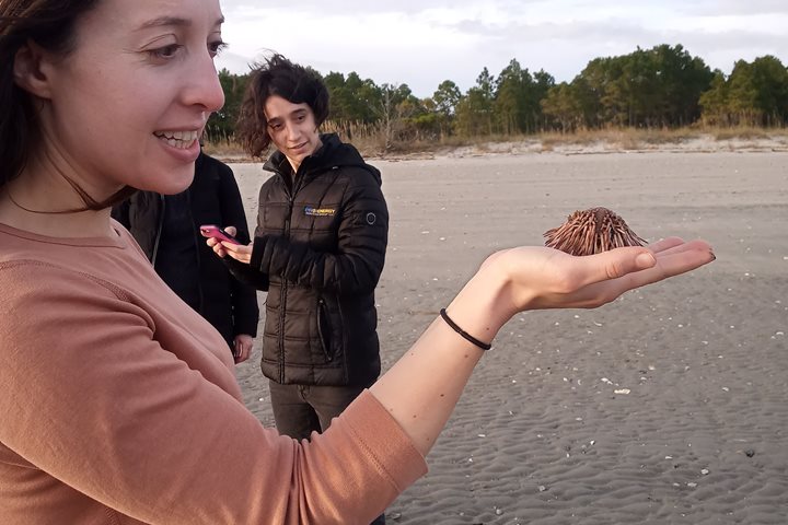 After a delicious morning breakfast, we set out on the M/V Godwit and Gannet to Saint Phillip’s Island State Park. Weaving through the channels of the saltmarsh in the morning light was a delightful tour of the sea-islands ecosystem. Estuarine bottlenose dolphins played in our wake as we passed by, moms and calves rising in tandem as they fished and played. Wading birds erupted from the coastal marshes, driven to the small grass mats by the exceptionally high tides.