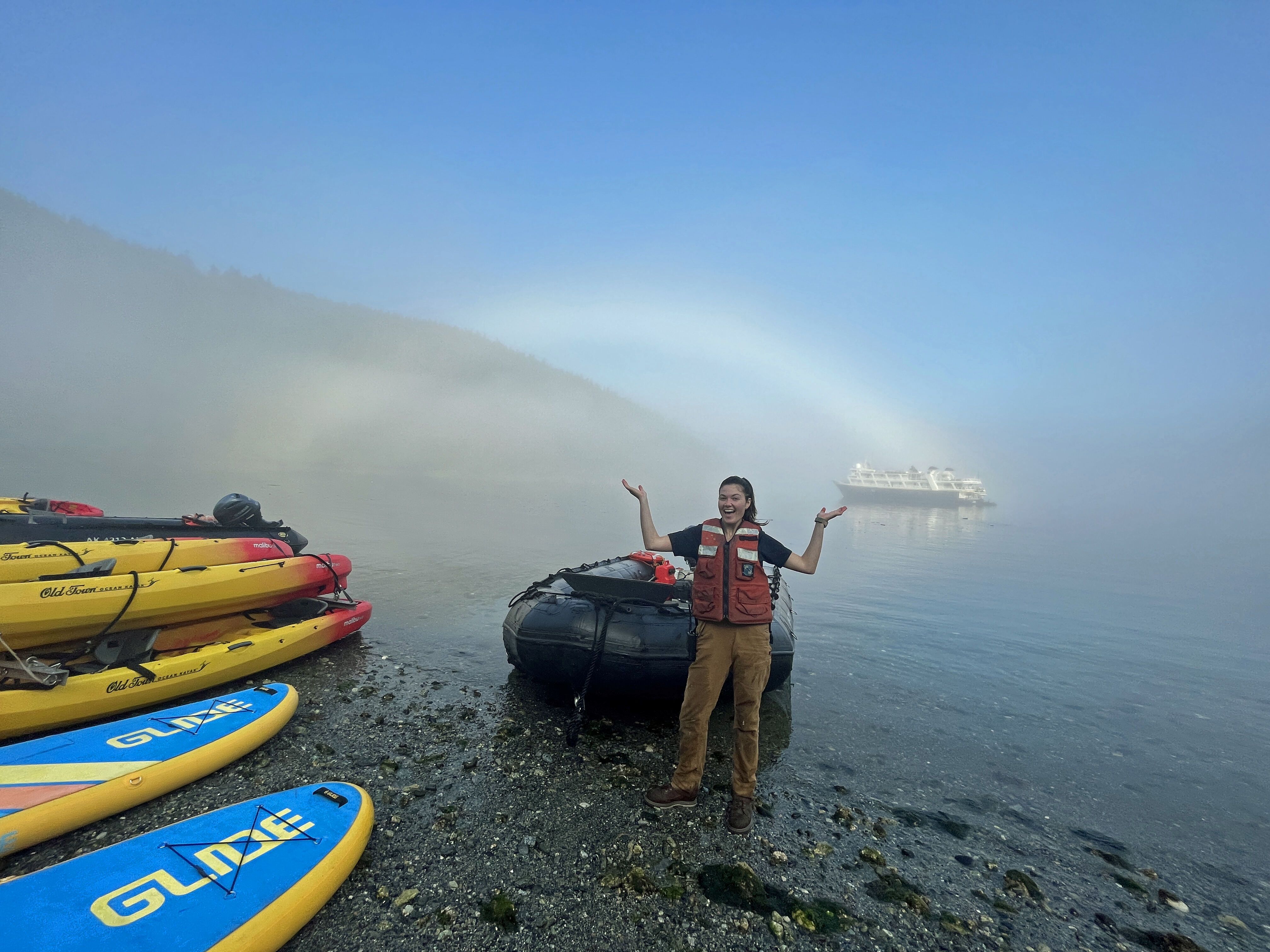 A bright, eerie fog blanketed the outer coast as we stepped onto the bow with our coffee this morning. Our explorations were wrapped in soft mystery until just before we headed ashore. As we entered a wild bay on the east side of Port Althorp, the view opened up in many ways. The ship’s crew arranged our brightly colored kayaks and paddleboards along the beach, and a fog bow arched across the bay. Some guests opted for the challenging hike; they charged up an incredibly steep slope to explore a muskeg. Moderate hikers explored the salt chuck and coastal meadow.