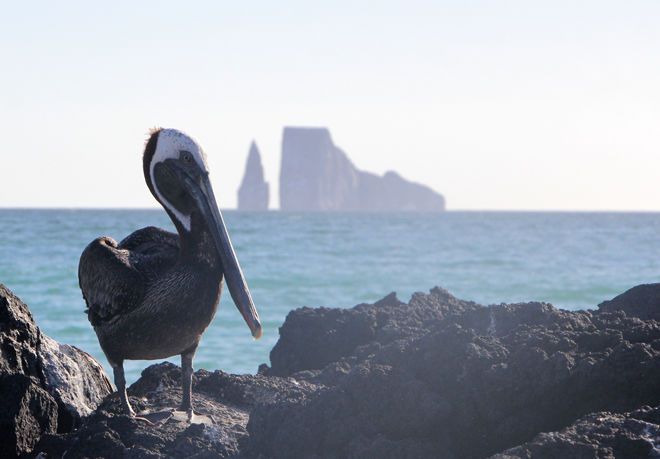 This island is the only location containing all three species of boobies. We easily saw blue-footed boobies nesting with their chicks who are now large enough to move around. The trees and bushes housed nesting red-footed boobies. These are the only nest builders of the three booby species. Along the shore we observed the larger Nazca boobies with their black and white coats blending in with the black lava and their own guano. The red vegetation growing from the ash gives this place a strikingly beautiful contrast.
