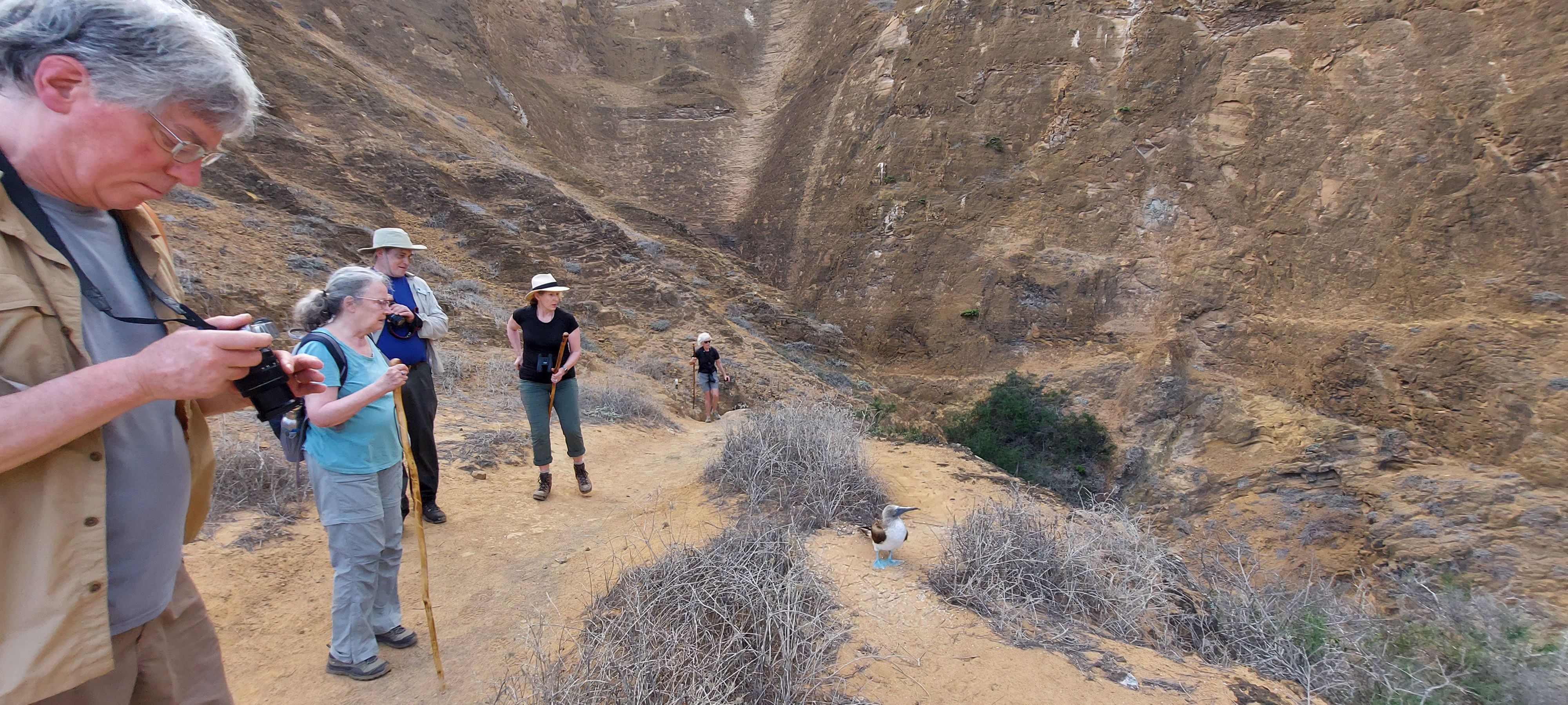Early in the morning, we visited Punta Pitt at San Cristobal Island, the easternmost of the islands in the Galapagos. The impressive cliff side is a hallmark of the site. Hiking through lava formations led us to a trail with a unique landscape. It was a perfect nesting site for red-footed and blue-footed boobies. The surrounding landscape, perfect for photos, is so colorful due to the red and green Sesuvium.