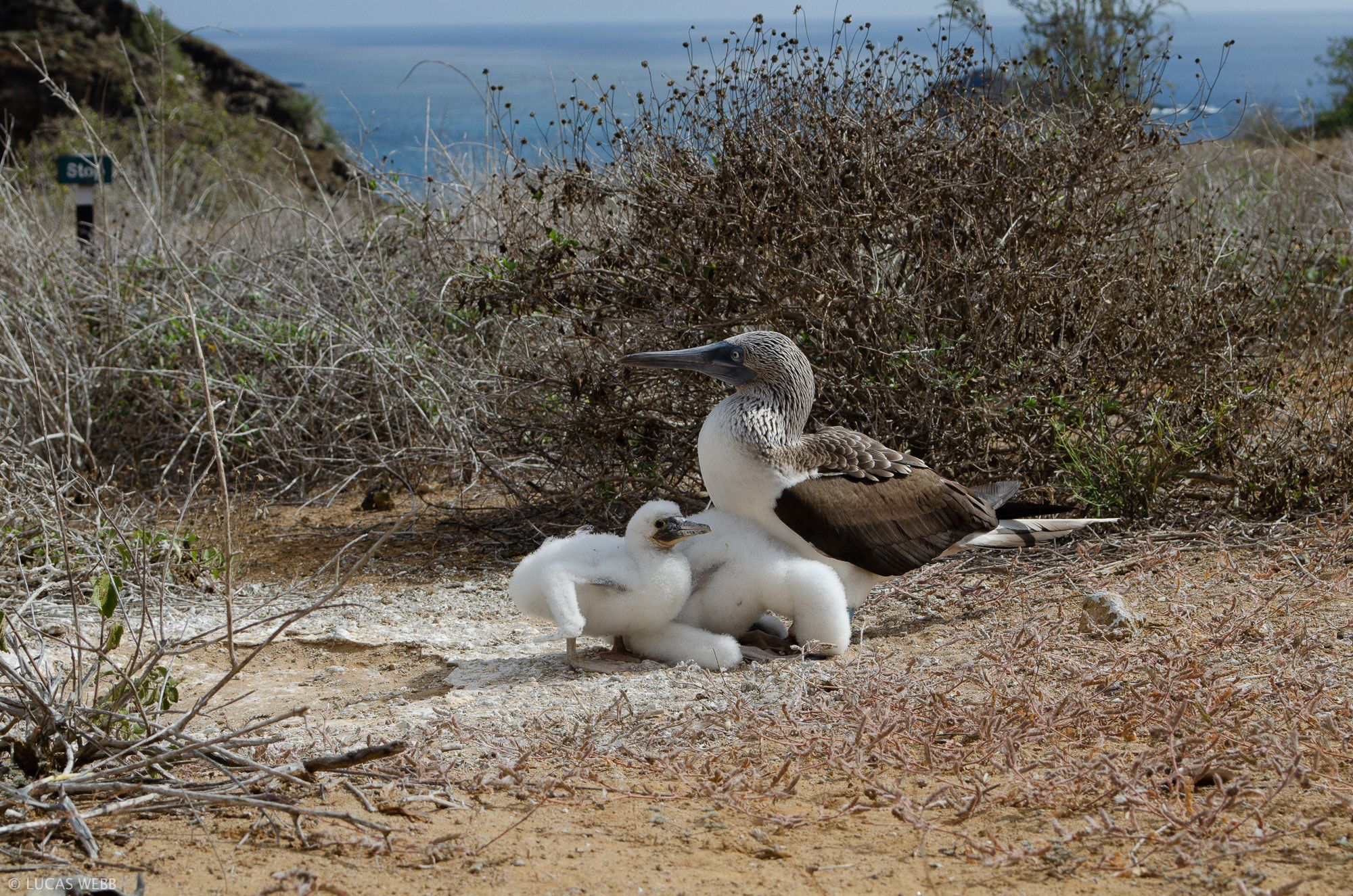 The landscape at Punta Pitt is breathtaking. The tuff cones are huge and have been eroded in a completely different way from other cones—they look like spikes on the back of an old dragon.  As we walked up, we found various endemic lava lizards and a few finches, but nonetheless the highlight of the walk was to see several blue-footed booby pairs with chicks of all different sizes. Some were just a few weeks old, and some were bigger than their parents, but all of them looked very healthy. It is a relief to see that these beautiful birds are coming back to nest on this site.