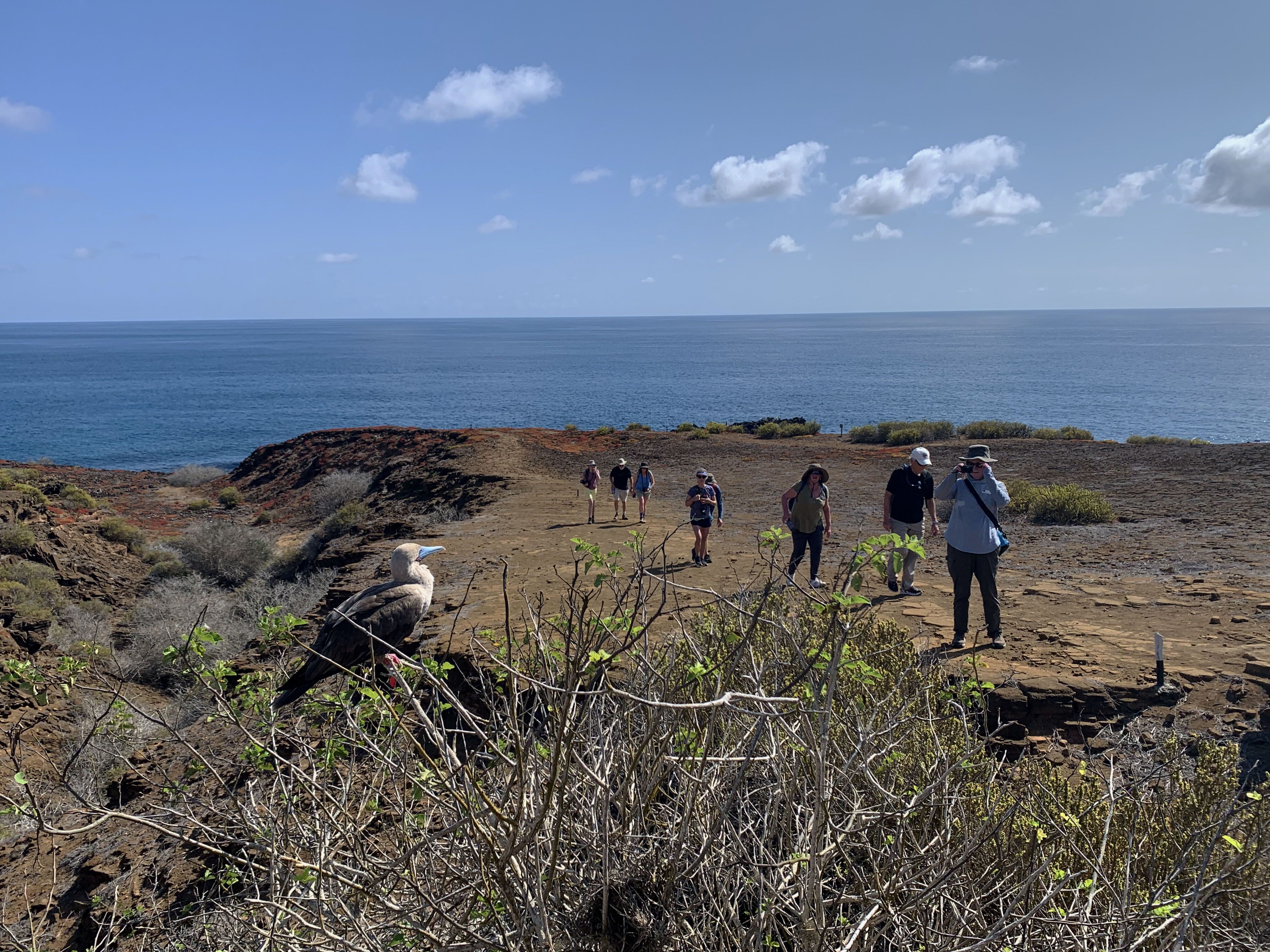 We woke up off the northern coast of San Cristobal. To start our day, we hiked up to Punta Pitt. During our expedition this week, we saw so many different species. We had not yet seen red-footed boobies, and today was our opportunity. As we walked up the hill, we could hear these colorful birds. Once we reached the highest elevation of the hike, we observed the majestic birds nesting on trees and bushes around the area. What a surprise to see so many birds doing different activities! They collected twigs for nests, kept their eggs warm, flew around, etc. The scene was astonishing. Red Galapagos carpetweed over golden, sandy terrain was a perfect contrast to the colors of the ocean and the black basaltic rocks of the imposing cliffs along the coast. It was a perfect time for group photos, and many of the guests invited naturalists to join their photos. What a fun time! This was followed by a refreshing and well-deserved break on the beach. We swam with sea lions and spotted eagle rays and different species of fish. Our time in the water was even better than expected.