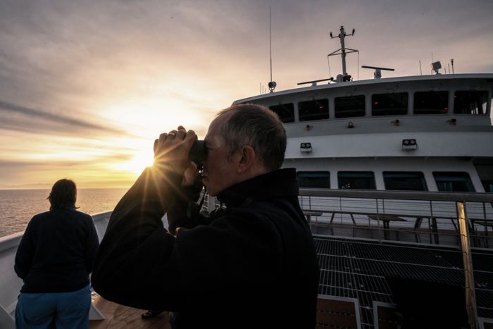 Today we woke with the shining stars and took Zodiacs ashore to meet our coaches for a trip to Chale, a small town on the shores of Magdalena Bay. The goal was to find some wintering gray whales, magnificent leviathans which frequent this coast to give birth before the long migration back to their Arctic feeding grounds. These whales did not disappoint! Spyhopping, breaching, and even a bit of tail flukes. As a result, there were lots of smiles and laughter all around! We returned to the town for lunch and then headed back out on the local boats for a second round. As we returned to the ship, the sun set over La Paz, with glassy waters of gold in the harbor, and pink clouds above. The constellations of Orion, Taurus, and the Pleiades shone over our Zodiacs on our way back to dinner aboard National Geographic Venture .